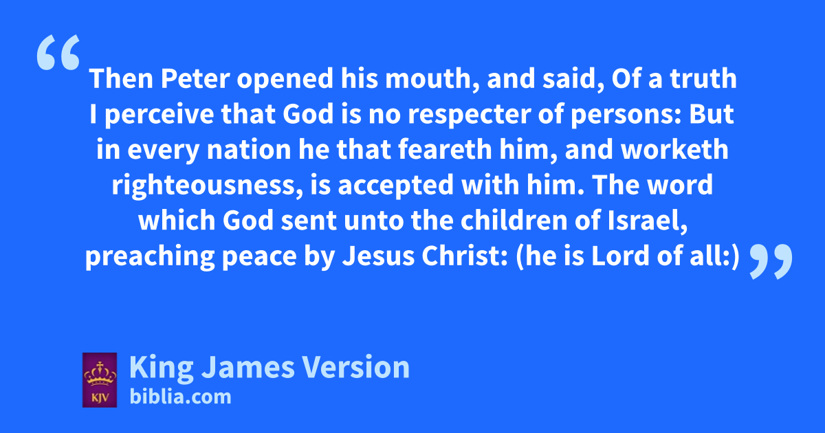34 Then Peter copened his mouth, and said, Of a truth I perceive that God is dno respecter of persons: 35 But ein every nation fhe that feareth him, and worketh righteousness, is accepted with him. 36 The word which God sent unto the children of Israel, preaching gpeace by Jesus Christ: h(he is iLord of all:) 37 That word, I say, ye know, which was published throughout all Judaea, and jbegan from Galilee, after the baptism which John preached; 38 How God kanointed Jesus of Nazareth with the Holy Ghost and with power: who went about doing good, and healing all that were oppressed of the devil; for lGod was with him. 39 And we are mwitnesses of all things which he did both in the land of the Jews, and in Jerusalem; nwhom they slew and hanged on a tree: 40 Him oGod raised up the third day, and shewed him openly; 41 pNot to all the people, but unto qwitnesses chosen before of God, even to us, rwho did eat and drink with him after he rose from the dead. 42 And she commanded us to preach unto the people, and to ttestify that uit is he which was xordained of God to be the Judge yof quick and dead. 43 To him give zall the prophets witness, that through his name awhosoever believeth in him shall receive bremission of sins.