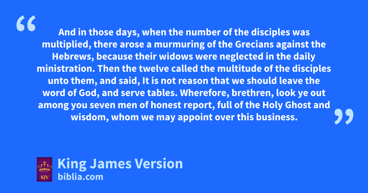 6 And in those days, awhen the number of the disciples was multiplied, there arose a murmuring of the bGrecians against the Hebrews, because their widows were neglected cin the daily ministration. 2 Then the twelve called the multitude of the disciples unto them, and said, dIt is not reason that we should leave the word of God, and serve etables. 3 Wherefore, brethren, flook ye out among you seven men gof honest report, full of the Holy Ghost and wisdom, whom we may appoint over this business. 4 But we will hgive ourselves continually to prayer, and to ithe ministry of the word. 5 And the saying pleased the whole multitude: and they chose Stephen, ka man full of faith and of the Holy Ghost, and lPhilip, and Prochorus, and Nicanor, and Timon, and Parmenas, and mNicolas a nproselyte of oAntioch: 6 Whom they set before the apostles: and when they had pprayed, they qlaid their hands on them. 7 And rthe word of God increased; and the number of the disciples multiplied in Jerusalem greatly; and sa great company of the priests were obedient to the faith.