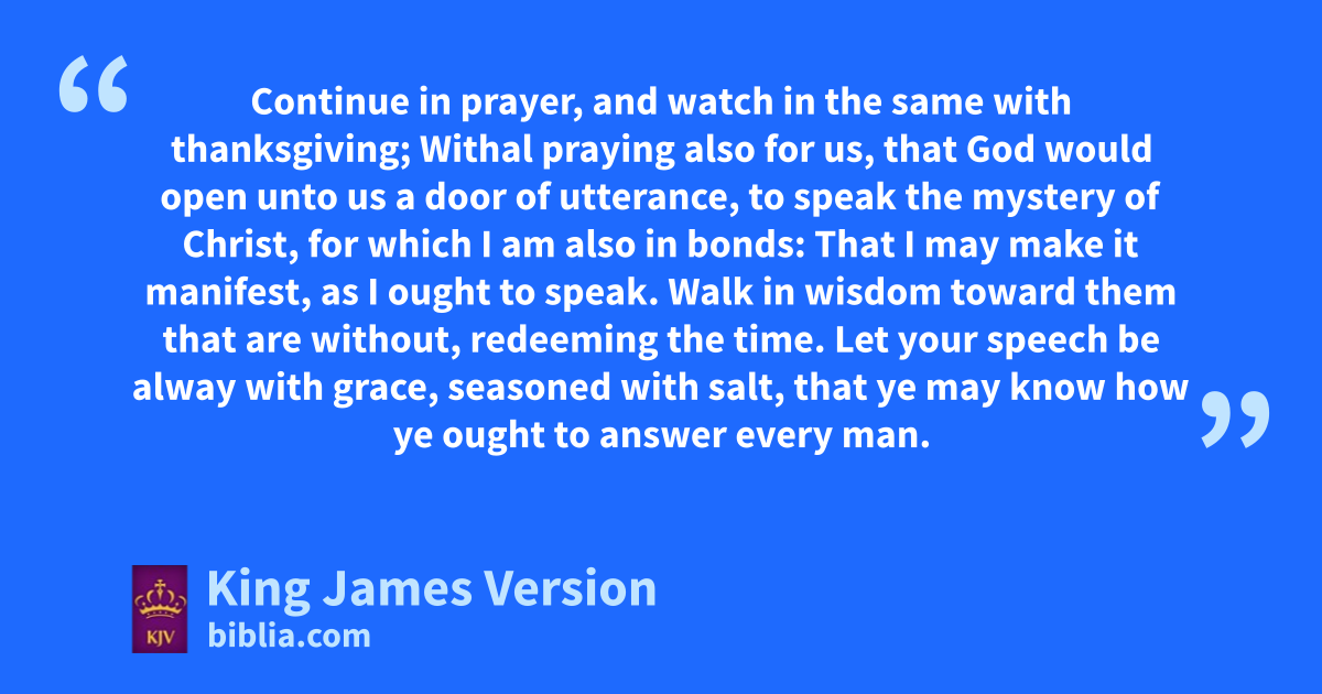 2 cdContinue ein prayer, and fwatch in the same gwith thanksgiving; 3 Withal hpraying also for us, that God would iopen unto us a door of utterance, to speak kthe mystery of Christ, lfor which I am also in bonds: 4 That mI may make it manifest, as I ought to speak. 5 nWalk oin wisdom toward pthem that are without, qredeeming the time. 6 Let your speech be alway rwith grace, sseasoned with salt, that ye may know thow ye ought to answer every man.