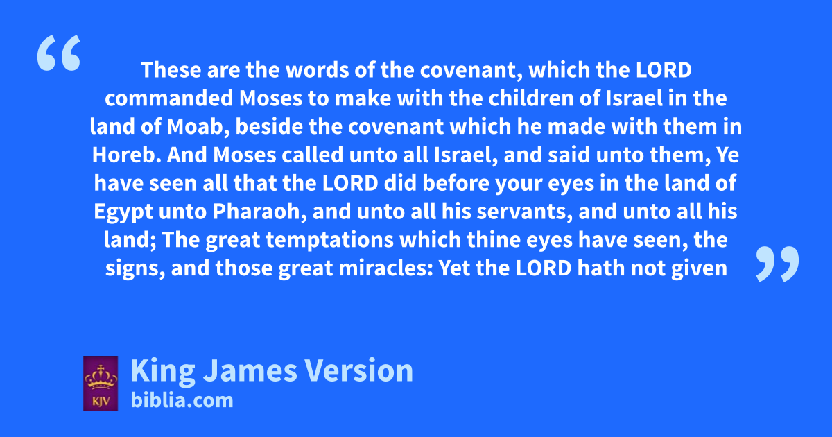 2 And Moses called unto all Israel, and said unto them, bYe have seen all that the Lord did before your eyes in the land of Egypt unto Pharaoh, and unto all his servants, and unto all his land; 3 cThe great temptations which thine eyes have seen, the signs, and those great miracles: 4 Yet dthe Lord hath not given you an heart to perceive, and eyes to see, and ears to hear, unto this day. 5 eAnd I have led you forty years in the wilderness: fyour clothes are not waxen old upon you, and thy shoe is not waxen old upon thy foot. 6 gYe have not eaten bread, neither have ye drunk wine or strong drink: that ye might know that I am the Lord your God. 7 And when ye came unto this place, hSihon the king of Heshbon, and Og the king of Bashan, came out against us unto battle, and we smote them: 8 And we took their land, and igave it for an inheritance unto the Reubenites, and to the Gadites, and to the half tribe of Manasseh. 9 jKeep therefore the words of this covenant, and do them, that ye may kprosper in all that ye do.