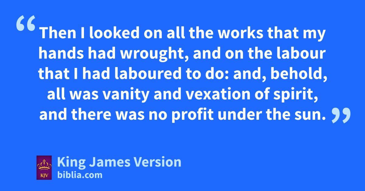 12 And I turned myself to behold wisdom, and bmadness, and cfolly: for what can the man do that cometh ccafter the king? ||deven that which hath been ealready done. 13 Then I saw †that wisdom excelleth cfolly, as far as light aexcelleth darkness. 14 fThe wise man’s eyes are in his head; but the fool walketh in darkness: and I myself perceived also gthat hone event happeneth to them all. 15 Then said I in my heart, As hit happeneth to the fool, so it †happeneth even to me; and why was I then imore wise? Then I said in my heart, that this also is vanity. 16 For there is jno remembrance of the wise more than of the fool for ever; seeing that which enow is in the days to come shall all be forgotten. And ghow dieth the wise man? as the fool. 17 Therefore I hated life; because the work that is wrought under the sun is grievous unto me: for all is kvanity and vexation of spirit. 18 Yea, I hated all my labour which I had †taken under the sun: because lI should leave it unto the man that shall be mafter me. 19 And lwho knoweth whether he shall be a wise man or a fool? yet shall he have rule over all my labour wherein I have laboured, and wherein I have shewed myself wise under the sun. This is also vanity. 20 Therefore I mmwent about to cause my heart to despair of all the labour which I took under the sun. 21 For there is a man whose labour is in wisdom, and in knowledge, and in nequity; yet to a man that hath not laboured therein shall he †leave it for his portion. This also is vanity and a great evil. 22 For what hath man oof all his labour, and of the pvexation of his heart, wherein he hath laboured under the sun? 23 For all qhis days are rsorrows, and his stravail rgrief; yea, his heart taketh not rest in the night. This is also vanity.