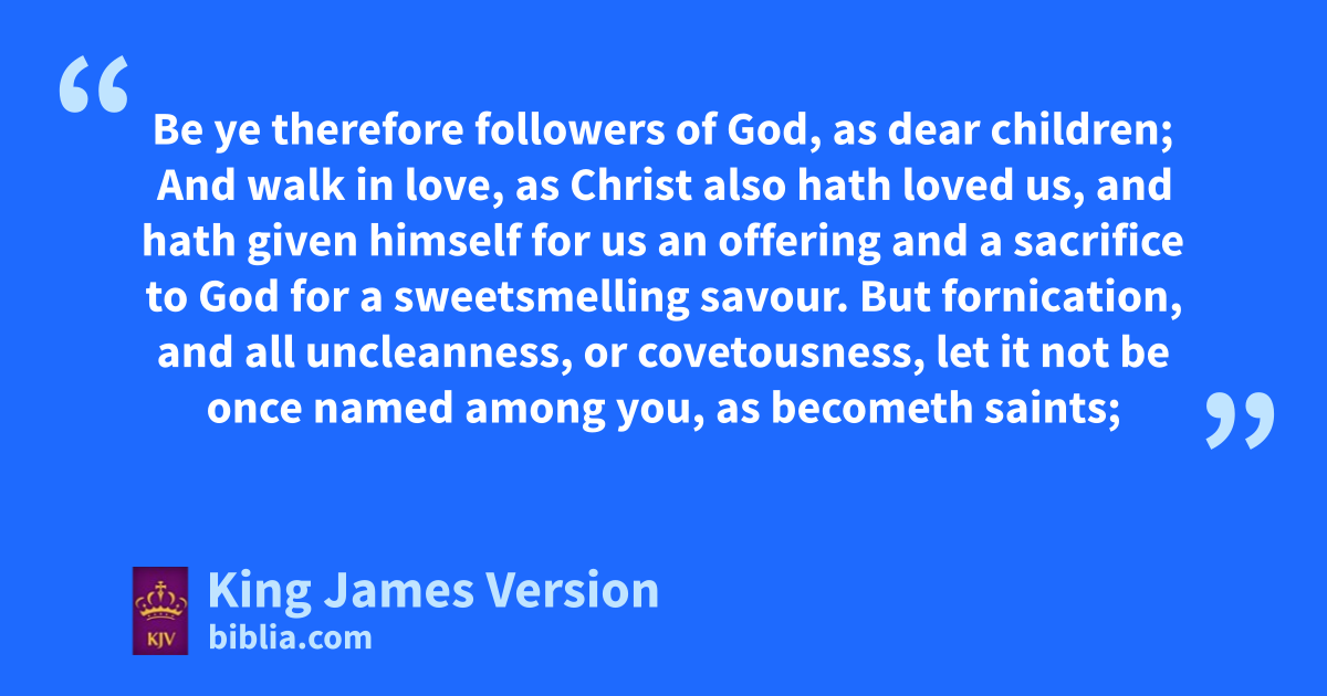 5 aBe ye therefore followers of God, as dear children; 2 And bwalk in love, cas Christ also hath loved us, and dhath given himself for us ean offering and a sacrifice to God for fa sweetsmelling savour. 3 But ghfornication, and all guncleanness, or gcovetousness, let it not be once inamed among you, as becometh saints; 4 Neither kfilthiness, nor foolish talking, nor jesting, lwhich are not convenient: but rather giving of thanks. 5 For this ye know, that mno whoremonger, nor unclean person, nor covetous man, nwho is an idolater, ohath any inheritance in the kingdom of Christ and of God. 6 pLet no man deceive you with vain words: for qbecause of these things cometh rthe wrath of God upon sthe children of ||disobedience. 7 Be not ye therefore tpartakers with them. 8 For uye were ssometimes darkness, but wnow are ye light in the Lord: xwalk as ychildren of light: 9 (For zthe fruit of the Spirit is in all agoodness and righteousness and truth;) 10 bProving what is cacceptable unto the Lord. 11 And dhave no fellowship with the eunfruitful fworks of darkness, but rather greprove them. 12 For hit is a shame even to speak of those things which are done of them in secret. 13 But all things that are ||reproved are made manifest by the light: for whatsoever idoth make manifest is light. 14 Wherefore ||he saith, klAwake thou that sleepest, and marise from the dead, and Christ shall give thee light. 15 See then that nye walk ocircumspectly, not as fools, but nas wise, 16 pRedeeming qthe time, rbecause the days are evil. 17 Wherefore nbe ye not unwise, but understanding what sthe will of the Lord is. 18 And tbe not drunk with wine, wherein is uexcess; but vbe filled with the Spirit; 19 Speaking to yourselves win xpsalms and yhymns and spiritual yysongs, singing and zmaking melody in your heart to the Lord; 20 aGiving thanks always for all things unto bGod and the Father cin the name of our Lord Jesus Christ; 21 dSubmitting yourselves one to another in the fear of God.