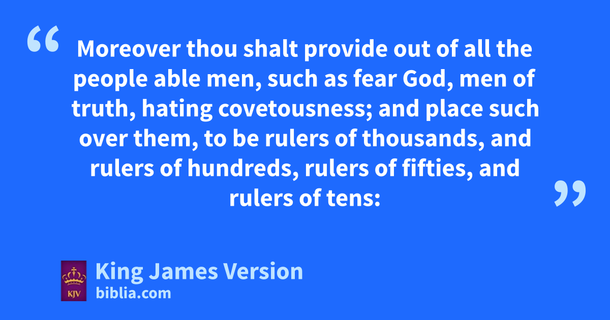 13 And it came to pass on the morrow, that Moses sat to judge the people: and the people stood by Moses from the morning unto the evening. 14 And when Moses’ father in law saw all that he did to the people, he said, What is this thing that thou doest to the people? why sittest thou thyself alone, and all the people stand by thee from morning unto even? 15 And Moses said unto his father in law, Because pthe people come unto me to inquire of God: 16 When they have qa matter, they come unto me; and I judge between †one and another, and I do rmake them know the statutes of God, and his laws. 17 And Moses’ father in law said unto him, The thing that thou doest is not good. 18 †Thou wilt surely wear away, both thou, and this people that is with thee: for this thing is too heavy for thee; sthou art not able to perform it thyself alone. 19 Hearken now unto my voice, I will give thee counsel, and tGod shall be with thee: Be thou ufor the people to God-ward, that thou mayest xbring the causes unto God: 20 And thou shalt yteach them ordinances and laws, and shalt shew them zthe way wherein they must walk, and athe work that they must do. 21 Moreover thou shalt provide out of all the people bable men, such as cfear God, dmen of truth, ehating covetousness; and place such over them, to be rulers of thousands, and rulers of hundreds, rulers of fifties, and rulers of tens: 22 And let them judge the people fat all seasons: gand it shall be, that every great matter they shall bring unto thee, but every small matter they shall judge: so shall it be easier for thyself, and they shall bear hthe burden with thee. 23 If thou shalt do this thing, and God command thee so, then thou shalt be iable to endure, and all this people shall also go to ktheir place in peace. 24 So Moses hearkened to the voice of his father in law, and did all that he had said. 25 And lMoses chose able men out of all Israel, and made them heads over the people, rulers of thousands, rulers of hundreds, rulers of fifties, and rulers of tens. 26 And they judged the people mat all seasons: the hard causes they brought unto Moses, but every small matter they judged themselves. 27 And Moses let his father in law depart; and nhe went his way into his own land.