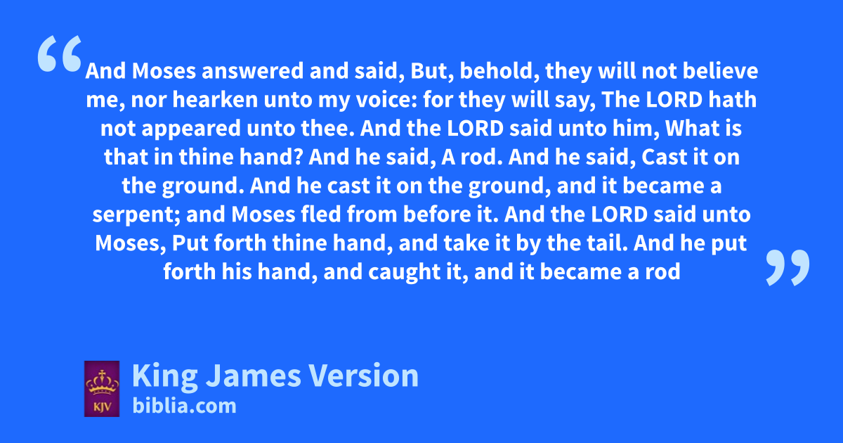 4 And Moses answered and said, But, behold, they will not believe me, nor hearken unto my voice: for they will say, The Lord hath not appeared unto thee. 2 And the Lord said unto him, What is that in thine hand? And he said, aA rod. 3 And he said, Cast it on the ground. And he cast it on the ground, and it became a serpent; and Moses fled from before it. 4 And the Lord said unto Moses, Put forth thine hand, and take it by the tail. And he put forth his hand, and caught it, and it became a rod in his hand: 5 That they may bbelieve that cthe Lord God of their fathers, the God of Abraham, the God of Isaac, and the God of Jacob, hath appeared unto thee. 6 And the Lord said furthermore unto him, Put now thine hand into thy bosom. And he put his hand into his bosom: and when he took it out, behold, his hand was leprous das snow. 7 And he said, Put thine hand into thy bosom again. And he put his hand into his bosom again; and plucked it out of his bosom, and, behold, eit was turned again as his other flesh. 8 And it shall come to pass, if they will not believe thee, neither hearken to the voice of the first sign, that they will believe the voice of the latter sign. 9 And it shall come to pass, if they will not believe also these two signs, neither hearken unto thy voice, that thou shalt take of the water of the river, and pour it upon the dry land: and fthe water which thou takest out of the river †shall become blood upon the dry land. 10 And Moses said unto the Lord, O my Lord, I am not †eloquent, neither †heretofore, nor since thou hast spoken unto thy servant: but gI am slow of speech, and of a slow tongue. 11 And the Lord said unto him, Who hath made man’s mouth? or who maketh the dumb, or deaf, or the seeing, or the blind? have not I the Lord? 12 Now therefore go, and I will be hwith thy mouth, and teach thee what thou shalt say. 13 And he said, O my Lord, send, I pray thee, by the hand iof him whom thou ||wilt send. 14 And the anger of the Lord was kindled against Moses, and he said, Is not Aaron the Levite thy brother? I know that he can speak well. And also, behold, he cometh forth to meet thee: and when he seeth thee, he will be glad in his heart. 15 And kthou shalt speak unto him, and lput words in his mouth: and I will be with thy mouth, and with his mouth, and will teach you what ye shall do. 16 And he shall be thy spokesman unto the people: and he shall be, even he shall be to thee instead of a mouth, and mthou shalt be to him instead of God. 17 And thou shalt take nthis rod in thine hand, wherewith thou shalt do signs. 18 And Moses went and returned to †Jethro his father in law, and said unto him, Let me go, I pray thee, and return unto my brethren which are in Egypt, and see whether they be yet alive. And Jethro said to Moses, Go in peace. 19 And the Lord said unto Moses in Midian, Go, return into Egypt: for oall the men are dead which sought thy life. 20 And Moses took his wife and his sons, and set them upon an ass, and he returned to the land of Egypt: and Moses took pthe rod of God in his hand. 21 And the Lord said unto Moses, When thou goest to return into Egypt, see that thou do all those qwonders before Pharaoh, which I have put in thine hand: but rI will harden his heart, that he shall not let the people go. 22 And thou shalt say unto Pharaoh, Thus saith the Lord, sIsrael is my son, teven my firstborn: 23 And I say unto thee, Let my son go, that he may serve me: and if thou refuse to let him go, behold, uI will slay thy son, even thy firstborn.