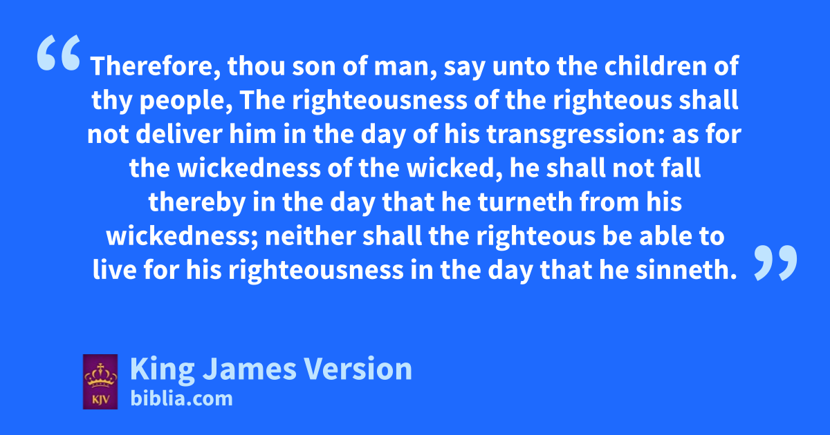 10 Therefore, O thou son of man, speak unto the house of Israel; Thus ye speak, saying, If our transgressions and our sins be upon us, and nwe pine away in them, ohow should we then live? 11 Say unto them, pAs I live, saith the Lord God, qI have no pleasure in the death of the wicked; but that the wicked turn from his way and live: turn ye, turn ye from your evil ways; for rwhy will ye die, O house of Israel? 12 Therefore, thou son of man, say unto athe children of thy people, sThe righteousness of the righteous shall not deliver him in the day of his transgression: as for the wickedness of the wicked, the shall not fall thereby in the day that he turneth from his wickedness; sneither shall the righteous be able to live for his righteousness in the day that he sinneth. 13 When I shall say to the righteous, that he shall surely live; sif he trust to his own righteousness, and commit iniquity, all his righteousnesses shall not be remembered; but for his iniquity that he hath committed, he shall die for it. 14 Again, uwhen I say unto the wicked, Thou shalt surely die; vif he turn from his sin, and vdo †that which is lawful and right; 15 If the wicked wrestore the pledge, xgive again that he had robbed, walk in ythe statutes of life, without committing iniquity; he shall surely live, he shall not die. 16 zNone of his sins that he hath committed shall be mentioned unto him: vhe hath done that which is lawful and right; he shall surely live. 17 aYet bthe children of thy people say, The way of the Lord is not equal: but as for them, their way is not equal. 18 cWhen the righteous turneth from his righteousness, and committeth iniquity, he shall even die thereby. 19 dBut if the wicked turn from his wickedness, and vdo that which is lawful and right, he shall live thereby. 20 aYet ye say, The way of the Lord is not equal. O ye house of Israel, eI will judge you every one after his ways.