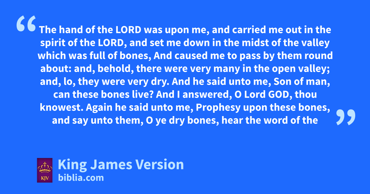 37 aThe hand of the Lord was upon me, and carried me out bin the spirit of the Lord, and set me down in the midst of cthe valley dwhich was full of bones, 2 And caused me to pass by them round about: and, behold, there were very many in the open ||cvalley; and, lo, they were very dry. 3 And he said unto me, Son of man, ecan these bones live? And I answered, O Lord God, fthou knowest. 4 Again he said unto me, Prophesy upon these bones, and say unto them, O ye dry bones, hear the word of the Lord. 5 Thus saith the Lord God unto these bones; Behold, gI will cause hbreath to enter into you, and ye shall live: 6 And I will lay isinews upon you, and will bring up flesh upon you, and icover you with skin, and put hbreath in you, and ye shall live; kand ye shall know that I am the Lord. 7 So I prophesied las I was commanded: and as I prophesied, there was a noise, and behold a shaking, and the bones came together, bone to his bone. 8 And when I beheld, lo, imthe sinews and the flesh came up upon them, and ithe skin covered them above: but there was no hbreath in them. 9 Then said he unto me, Prophesy unto the ||wind, prophesy, son of man, and say to the wind, Thus saith the Lord God; Come from nthe four winds, O breath, and gbreathe upon these slain, that they may live. 10 So I prophesied las he commanded me, and hothe breath came into them, and they lived, and ostood up upon their feet, an exceeding great army. 11 Then he said unto me, Son of man, these bones are the whole house of Israel: behold, they say, pOur bones are dried, and qour hope is lost: rwe are cut off for our parts. 12 Therefore prophesy and say unto them, Thus saith the Lord God; Behold, O my people, dsI will open your graves, and cause you to come up out of your graves, and tbring you into the land of Israel. 13 kAnd ye shall know that I am the Lord, when I have opened your graves, O my people, and brought you up out of your graves, 14 And oushall put my hspirit in you, and ye shall live, and I shall place you in your own land: then shall ye know that I the Lord vhave spoken it, and performed it, saith the Lord.