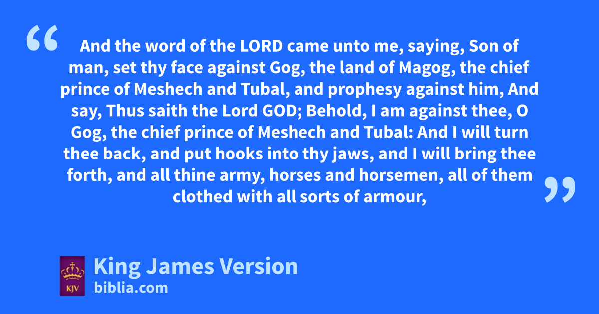 38 And the word of the Lord came unto me, saying, 2 aSon of man, bset thy face against acGog, the land of cdMagog, ||athe chief prince of eMeshech and eTubal, aand prophesy against him, 3 And say, Thus saith the Lord God; aBehold, fI am against thee, O cGog, athe chief prince of eMeshech and eTubal: 4 gAnd I will turn thee back, and hput hooks into thy jaws, and I will bring thee forth, and iall thine army, horses and ihorsemen, all of them kclothed with all sorts of armour, even a great company with lbucklers and lshields, all of them handling swords: 5 mPersia, nEthiopia, and ||mLibya with them; all of them with mshield and mhelmet: 6 oGomer, and all his pbands; the house of qTogarmah rof sthe north quarters, and all his pbands: and rmany people with thee. 7 tBe thou prepared, and uprepare for thyself, thou, and all thy company that are assembled unto thee, and be thou a guard unto them. 8 vAfter many days wthou shalt be visited: vin the latter years thou shalt come into the land that is brought back from the sword, and is xgathered out of many people, against ythe mountains of Israel, which zhave been always waste: but it is brought forth out of the nations, and they shall adwell safely all of them. 9 Thou shalt ascend and come blike a cstorm, thou shalt be dlike a cloud to cover the land, thou, and all ethy bands, eand many people with thee.