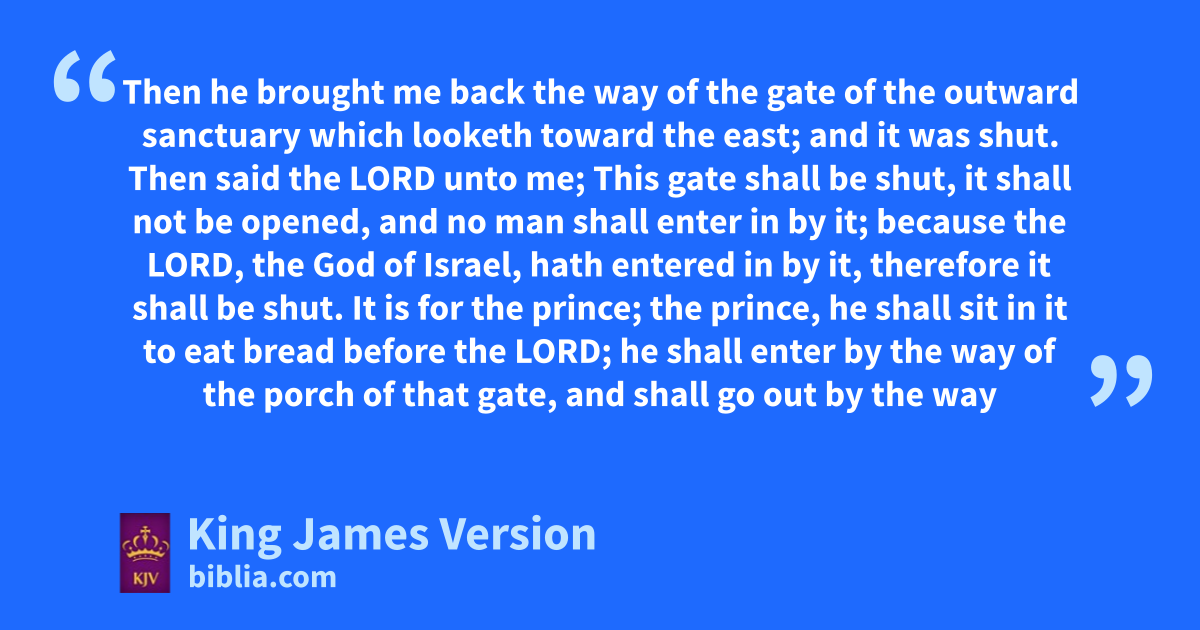 44 Then he brought me aback the way of bthe gate of the outward sanctuary bwhich looketh toward the east; and it was shut. 2 Then said the Lord unto me; This gate shall be shut, it shall not be opened, and no man shall enter in by it; cbecause the Lord, the God of Israel, hath entered in by it, therefore it shall be shut. 3 It is for dthe prince; the prince, he shall sit in it to eeat bread before the Lord; fhe shall enter by the way of the porch of that gate, and shall go out by the way of the same.