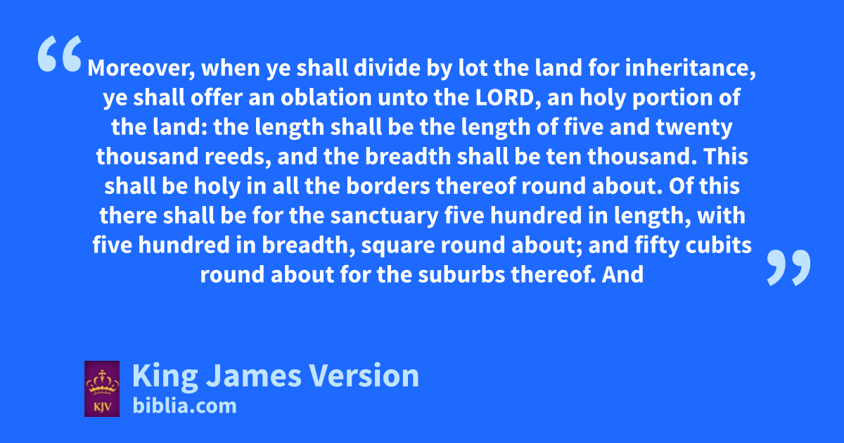 45 Moreover, †when ye shall adivide by lot the land for inheritance, bye shall offer an coblation unto the Lord, †an holy portion of the land: bthe length shall be the length of five and twenty thousand dreeds, and the breadth shall be ten thousand. This shall be holy in all the borders thereof round about. 2 Of this there shall be for the sanctuary efive hundred in length, with five hundred in breadth, fsquare round about; and fifty cubits round about for gthe ||suburbs thereof. 3 And hof this measure shalt thou measure bhthe length of five and twenty thousand, and the breadth of ten thousand: and iin it shall be the sanctuary and kthe most holy place. 4 hThe holy portion of the land shall be lfor the priests the ministers of the sanctuary, mwhich shall come near to minister unto the Lord: and it shall be a place for their houses, and nan holy place for the sanctuary. 5 And othe five and twenty thousand of length, and the ten thousand of breadth, oshall also the Levites, pthe ministers of the house, have for themselves, for a possession for qtwenty chambers. 6 And rye shall appoint the possession of the city five thousand broad, and five and twenty thousand long, rrover against cthe oblation of the holy portion: sit shall be for the whole house of Israel. 7 And ssa portion shall be for tthe prince on the one side and on the other side of cthe oblation of the holy portion, and of the possession of the city, before the oblation of the holy portion, and before the possession of the city, from the west side westward, and from the east side eastward: and the length shall be over against one of the portions, from the west border unto the east border. 8 In the land shall be his possession in Israel: and umy princes shall no more uuvoppress my people; and the rest of uuthe land shall they give to the house of Israel waccording to their tribes.