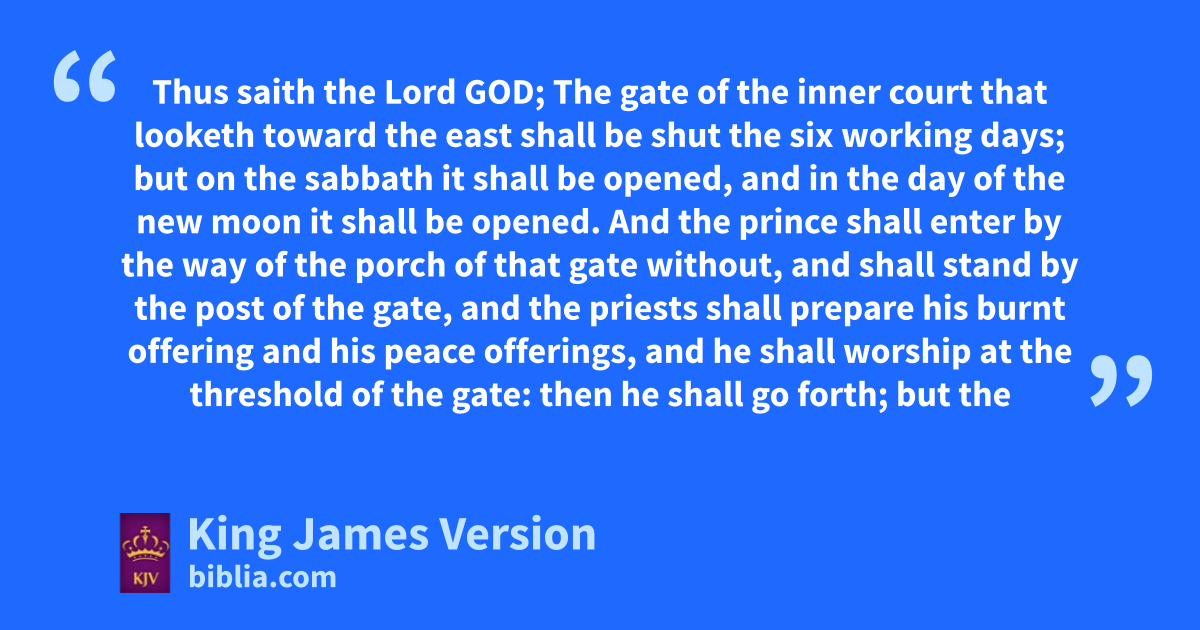 46 Thus saith the Lord God; aThe gate of bthe inner court that looketh toward the east shall be shut cthe six working days; but on the sabbath it shall be opened, and in dthe day of the new moon it shall be opened. 2 And ethe prince shall enter by the way of the porch of that gate without, and shall stand by fthe post of the gate, and gthe priests shall prepare his burnt offering and his peace offerings, and he shall worship at hthe threshold of the gate: then he shall go forth; but the gate shall not be shut until the evening. 3 Likewise ithe people of the land shall worship at the door of this gate before the Lord in the sabbaths and in dthe new moons. 4 And jthe burnt offering that the prince kshall offer unto the Lord lin the sabbath day shall be six lambs without blemish, and a ram without blemish. 5 And lmthe meat offering shall be nan ephah for a ram, and the meat offering for the lambs †as he shall be able to give, and oan hin of oil to an ephah. 6 And in dthe day of the new moon it shall be pa young bullock without blemish, and six lambs, and a ram: they shall be without blemish. 7 And he shall prepare ma meat offering, nan ephah for a bullock, and an ephah for a ram, and for the lambs according qas his hand shall attain unto, and oan hin of oil to an ephah. 8 And ewhen the prince shall enter, he shall go in by the way of the porch of that gate, and he shall go forth by the way thereof.