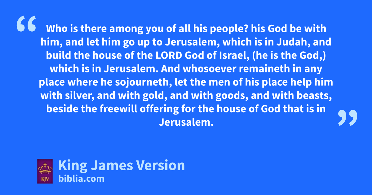 1 *Now in the first year of Cyrus king of Persia, that the word of the Lord aby the mouth of Jeremiah might be fulfilled, the Lord stirred up the spirit of Cyrus king of Persia, bthat he †made a proclamation throughout all his kingdom, and put it also in writing, saying, 2 Thus saith Cyrus king of Persia, The Lord God of heaven hath given me all the kingdoms of the earth; and he hath ccharged me to build him an house at Jerusalem, which is in Judah. 3 Who is there among you of all his people? his God be with him, and let him go up to Jerusalem, which is in Judah, and build the house of the Lord God of Israel, d(he is the God,) which is in Jerusalem. 4 And whosoever remaineth in any place where he sojourneth, let the men of his place †help him with silver, and with gold, and with goods, and with beasts, beside the freewill offering for the house of God that is in Jerusalem.