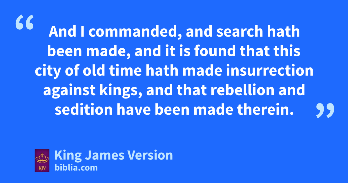 Thy servants the men on this side the river, and at such a time. 12 *Be it known unto the king, that the Jews which came up from thee to us are come unto Jerusalem, building the rebellious and the bad city, and have ||set up the walls thereof, and †joined the foundations. 13 Be it known now unto the king, that, if this city be builded, and the walls set up again, then will they not †pay ttoll, tribute, and custom, and so thou shalt endamage the ||revenue of the kings. 14 Now because †we have maintenance from the king’s palace, and it was not meet for us to see the king’s dishonour, therefore have we sent and certified the king; 15 That search may be made in the book of the records of thy fathers: so shalt thou find in the book of the records, and know that this city is a rebellious city, and hurtful unto kings and provinces, and that they have †moved sedition †within the same of old time: for which cause was this city destroyed. 16 We certify the king that, if this city be builded again, and the walls thereof set up, by this means thou shalt have no portion on this side the river.