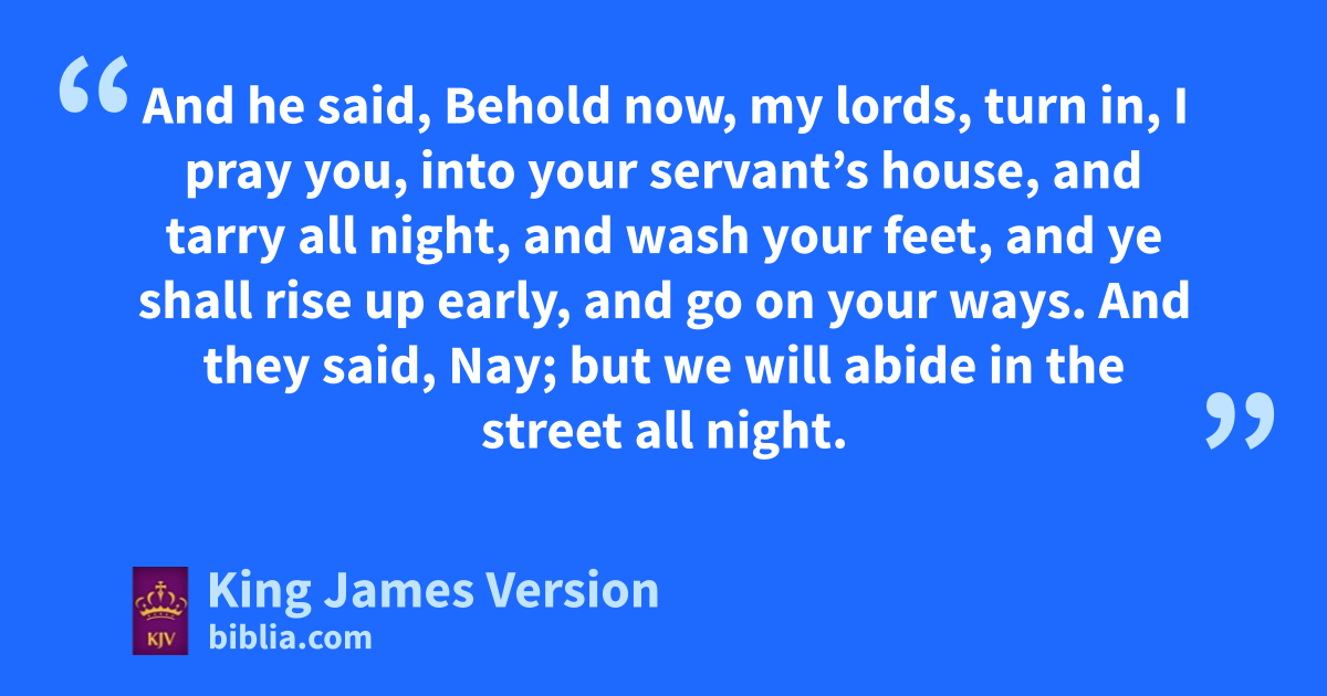 19 And there acame two angels to Sodom at even; and Lot sat in the gate of Sodom: and bLot seeing them rose up to meet them; and he bowed himself with his face toward the ground; 2 And he said, Behold now, my lords, cturn in, I pray you, into your servant’s house, and tarry all night, and dwash your feet, and ye shall rise up early, and go on your ways. And they said, eNay; but we will abide in the street all night. 3 And he pressed upon them greatly; and they turned in unto him, and entered into his house; and he made them a feast, and did bake unleavened bread, and they did eat. 4 But before they lay down, the men of the city, even the men of Sodom, compassed the house round, both old and young, all the people from every quarter: 5 fAnd they called unto Lot, and said unto him, Where are the men which came in to thee this night? gbring them out unto us, that we hmay know them. 6 And iLot went out at the door unto them, and shut the door after him, 7 And said, I pray you, brethren, do not so wickedly. 8 kBehold now, I have two daughters which have not known man; let me, I pray you, bring them out unto you, and do ye to them as is good in your eyes: only unto these men do nothing; lfor therefore came they under the shadow of my roof. 9 And they said, Stand back. And they said again, This one fellow mcame in to sojourn, nand he will needs be a judge: now will we deal worse with thee, than with them. And they pressed sore upon the man, even Lot, and came near to break the door. 10 But the men put forth their hand, and pulled Lot into the house to them, and shut to the door. 11 And they smote the men that were at the door of the house with oblindness, both small and great: so that they wearied themselves to find the door. 12 And the men said unto Lot, Hast thou here any besides? son in law, and thy sons, and thy daughters, and whatsoever thou hast in the city, pbring them out of this place: 13 For we will destroy this place, because the cry of them is waxen great before the face of the Lord; and the Lord hath sent us to destroy it. 14 And Lot went out, and spake unto his qsons in law, which married his daughters, and said, rUp, get you out of this place; for the Lord will destroy this city. But he seemed as one that mocked unto his sons in law. 15 And when the morning arose, then the angels hastened Lot, saying, Arise, take thy wife, and thy two daughters, which †are here; lest thou be consumed in the ||iniquity of the city. 16 And while he lingered, the men laid hold upon his hand, and upon the hand of his wife, and upon the hand of his two daughters; sthe Lord being merciful unto him: and they brought him forth, and set him without the city. 17 And it came to pass, when they had brought them forth abroad, that he said, Escape for thy life; tlook not behind thee, neither stay thou in all the plain; escape to the mountain, lest thou be consumed. 18 And Lot said unto them, Oh, unot so, my Lord: 19 Behold now, thy servant hath found grace in thy sight, and thou hast magnified thy mercy, which thou hast shewed unto me in saving my life; and I cannot escape to the mountain, lest some evil take me, and I die: 20 Behold now, this city is near to flee unto, and it is a little one: Oh, let me escape thither, (is it not a little one?) and my soul shall live. 21 And he said unto him, See, wI have accepted †thee concerning this thing also, that I will not overthrow this city, for the which thou hast spoken. 22 Haste thee, escape thither; for xI cannot do any thing till thou be come thither. Therefore ythe name of the city was called ||Zoar. 23 The sun was †risen upon the earth when Lot entered into Zoar. 24 Then zthe Lord rained upon Sodom and upon Gomorrah brimstone and fire from the Lord out of heaven; 25 And he overthrew those cities, and all the plain, and all the inhabitants of the cities, and that which grew upon the ground. 26 But his wife looked back from behind him, and she became aa pillar of salt. 27 And Abraham gat up early in the morning to the place where bhe stood before the Lord: 28 And he looked toward Sodom and Gomorrah, and toward all the land of the plain, and beheld, and, lo, cthe smoke of the country went up as the smoke of a furnace. 29 And it came to pass, when God destroyed the cities of the plain, that God dremembered Abraham, and sent Lot out of the midst of the overthrow, when he overthrew the cities in the which Lot dwelt.