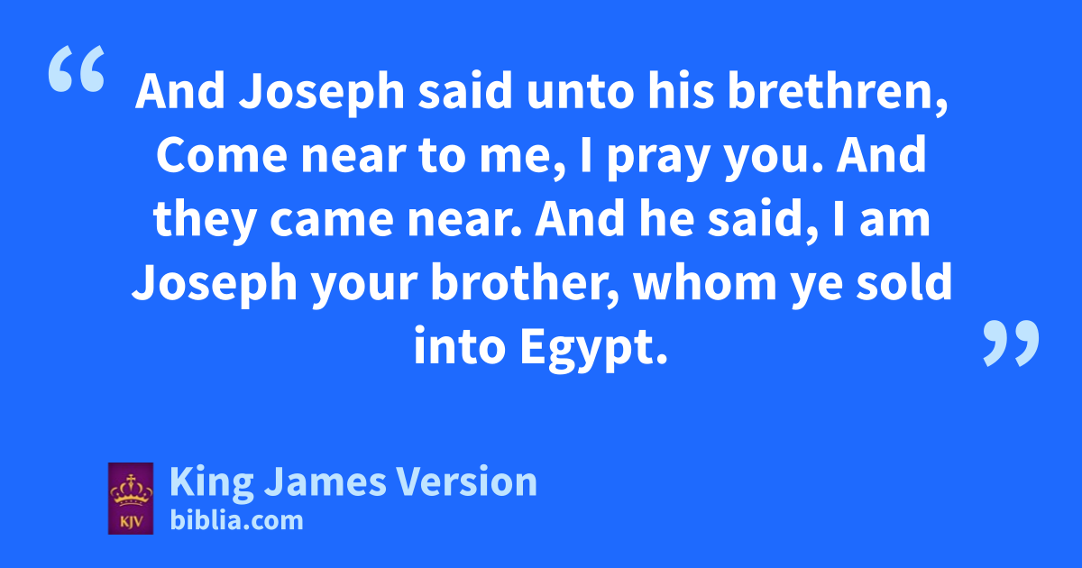 45 Then Joseph could not arefrain himself before all them that stood by him; and he cried, Cause every man to go out from me. And there stood no man with him, while Joseph made himself known unto his brethren. 2 And he †wept aloud: and the Egyptians and the house of Pharaoh heard. 3 And Joseph said unto his brethren, bI am Joseph; doth my father yet live? And his brethren could not answer him; for they were ||troubled at his presence. 4 And Joseph said unto his brethren, Come near to me, I pray you. And they came near. And he said, I am Joseph your brother, whom ye sold into Egypt. 5 Now therefore be not grieved, †nor angry with yourselves, that ye sold me hither: cfor God did send me before you to preserve life. 6 For these two years hath the famine been in the land: and yet there are five years, in the which there shall neither be dearing nor harvest. 7 And God sent me before you †to preserve you a posterity in the earth, and to save your lives by a great deliverance. 8 So now it was not you that sent me hither, but God: and he hath made me a efather to Pharaoh, and lord of all his house, and a eruler throughout all the land of Egypt. 9 Haste ye, and go up to my father, and say unto him, Thus saith thy son Joseph, God hath made me lord of all Egypt: come down unto me, tarry not: 10 And fthou shalt dwell in the land of Goshen, and thou shalt be near unto me, thou, and thy children, and thy children’s children, and thy flocks, and thy herds, and all that thou hast: 11 And there will I nourish thee; for yet there are five years of famine; lest thou, and thy household, and all that thou hast, gcome to poverty. 12 And, behold, your eyes see, and the eyes of my brother Benjamin, that it is my mouth that speaketh unto you. 13 And ye shall tell my father of all my glory in Egypt, and of all that ye have seen; and ye shall haste and hbring down my father hither. 14 And he fell upon his brother Benjamin’s neck, and wept; and Benjamin wept upon his neck. 15 Moreover he kissed all his brethren, and wept upon them: and after that his brethren talked with him.