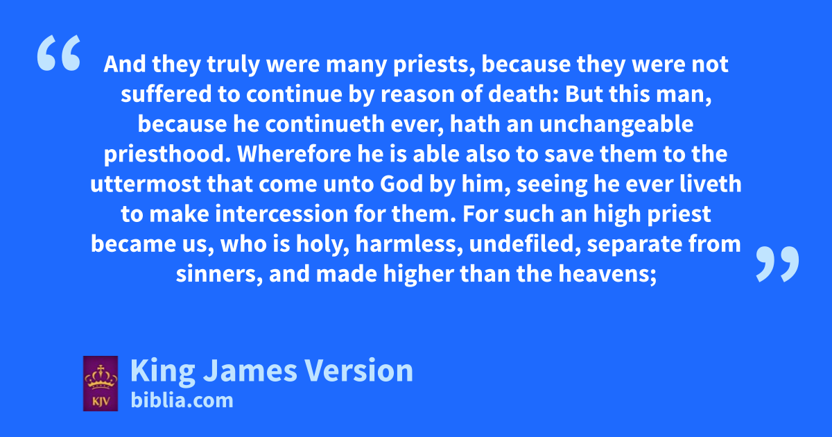 7 For this aMelchisedec, king of bSalem, priest of cthe most high God, who met Abraham returning from the slaughter of the kings, and blessed him; 2 aTo whom also Abraham gave a tenth part of all; first being by interpretation King of righteousness, and after that also King of bSalem, which is, King of dpeace; 3 Without father, without mother, †without descent, having neither beginning of days, nor end of life; but made like unto ethe Son of God; abideth a priest fcontinually. 4 Now consider how great this man was, aunto whom even gthe patriarch Abraham gave the tenth of the spoils. 5 And verily hthey that are of the sons of Levi, who receive the office of the priesthood, have a commandment to take tithes of the people according to the law, that is, of their brethren, though ithey come out of the loins of Abraham: 6 But he whose ||descent is not counted from them areceived tithes of Abraham, and ablessed jhim that had the promises. 7 And without all kcontradiction the less is blessed of the better. 8 And here men that die receive tithes; but there he receiveth them, of whom lit is witnessed that mhe liveth. 9 And as I may so say, Levi also, who receiveth tithes, payed tithes in Abraham. 10 For ihe was yet in the loins of his father, awhen Melchisedec met him. 11 nIf therefore perfection were by the Levitical priesthood, (for under it the people oreceived the law,) what further need was there that another priest should rise pafter the order of Melchisedec, and not be called after the order of Aaron? 12 For the priesthood being changed, there is made of necessity a change also of the law. 13 For qhe of whom these things are spoken pertaineth to another tribe, of which no man gave attendance at the altar. 14 For it is evident that qrour Lord ssprang out of tJuda; of which tribe Moses spake nothing concerning priesthood. 15 And it is yet far more evident: for that after the similitude of Melchisedec there ariseth another priest, 16 Who is made, not after the law of tta carnal commandment, but after the power of an endless life. 17 For uhe testifieth, vThou art a priest for ever after the order of Melchisedec. 18 For there is verily a disannulling of the commandment going before nfor wthe weakness and unprofitableness thereof. 19 For nxthe law made nothing perfect, ||but the bringing in of ya better zhope did; by the which awe draw nigh unto God. 20 And inasmuch as not without an oath he was made priest: 21 (For those priests were made ||without an oath; but this with an oath by him that said unto him, vThe Lord sware and will not brepent, Thou art a priest for ever after the order of Melchisedec:) 22 By so much was Jesus made ca surety of da ybetter etestament. 23 And they truly were many priests, because they were not suffered to continue by reason of death: 24 But this man, because he continueth fever, hath ||an unchangeable priesthood. 25 Wherefore he is able also to save them ||gto the uttermost ahthat come unto God by him, seeing he ever liveth ito make intercession for them.