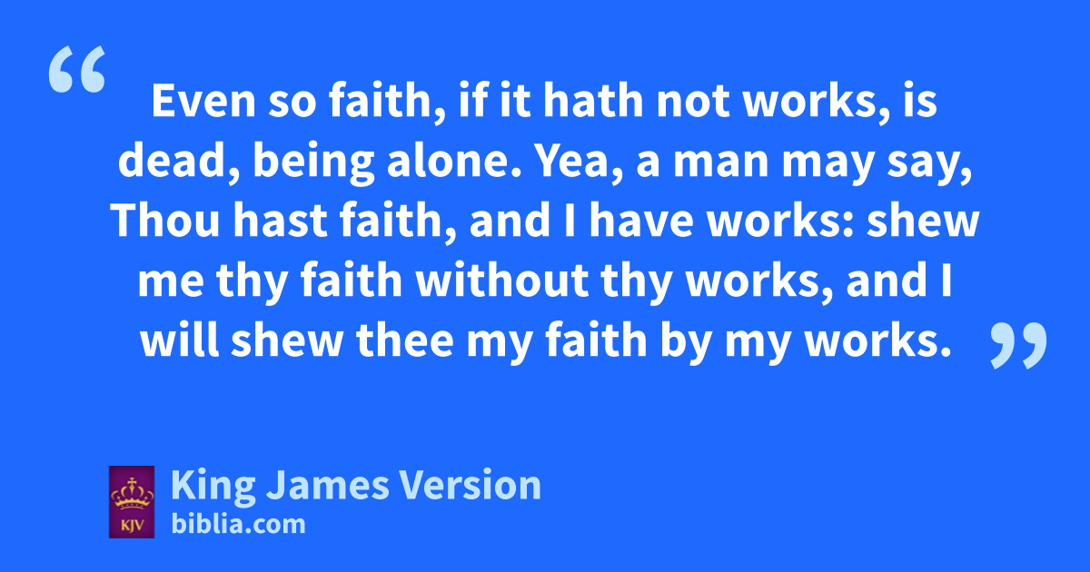 14 hWhat doth it profit, my brethren, though a man say he hath faith, and have not works? can faith save him? 15 jIf a brother or sister be knaked, and destitute of daily food, 16 And lone of you say unto them, Depart in peace, be ye warmed and filled; mnotwithstanding ye give them not those things which are needful to the body; hwhat doth it profit? 17 Even so faith, if it hath not works, is dead, being †alone. 18 Yea, a man may say, Thou hast faith, and I have works: shew me thy faith ||without thy works, and I will nshew thee omy faith by my works. 19 pThou believest that there is one God; thou doest well: qthe devils also rbelieve, and tremble. 20 But wilt thou know, O svain man, that faith twithout works is dead? 21 Was not Abraham our father justified by works, uwhen he had offered Isaac his son upon the altar? 22 ||Seest thou vhow faith wrought with his works, and wby works was faith made perfect? 23 And xthe scripture was fulfilled which saith, yAbraham believed God, and it was imputed unto him for righteousness: and he was called zthe Friend of God. 24 Ye see then how that aby works a man is justified, and anot by faith only. 25 Likewise also bwas not Rahab the harlot justified by works, when she had creceived the messengers, and had sent them out another way? 26 For as the body dwithout the ||spirit is dead, so faith dwithout works is dead also.