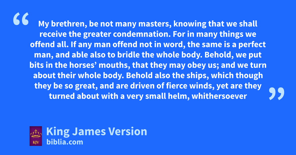 3 My brethren, abe not many bmasters, knowing that we shall receive the greater ||condemnation. 2 For cin many things we doffend all. eIf any man doffend not in word, fthe same is a gperfect man, and able also hto bridle the whole body. 3 Behold, iwe put hbits in the horses’ mouths, that they may obey us; and we turn about their whole body. 4 Behold also the ships, which though they be so great, and are driven of fierce winds, yet are they turned about with a very small helm, whithersoever the governor listeth. 5 Even so the tongue is a little member, and kboasteth great things. Behold, how great ||a matter a little fire kindleth! 6 And lthe tongue is a fire, a world of iniquity: so is the tongue among our members, that mit defileth the whole body, and setteth on fire the †course of nature; and nit is set on fire of ohell. 7 For every †kind of beasts, and of birds, and of serpents, and of things in the sea, is tamed, and hath been tamed of †mankind: 8 But the tongue can no man tame; it is an unruly evil, pfull of deadly poison. 9 Therewith bless we qGod, even the Father; and therewith curse we men, rwhich are made after the similitude of God. 10 Out of the same mouth proceedeth blessing and cursing. My brethren, these things ought not so to be. 11 Doth a fountain send forth at the same ||place sweet water and bitter? 12 Can the fig tree, my brethren, bear olive berries? either a vine, figs? so can no fountain both yield salt water and fresh.