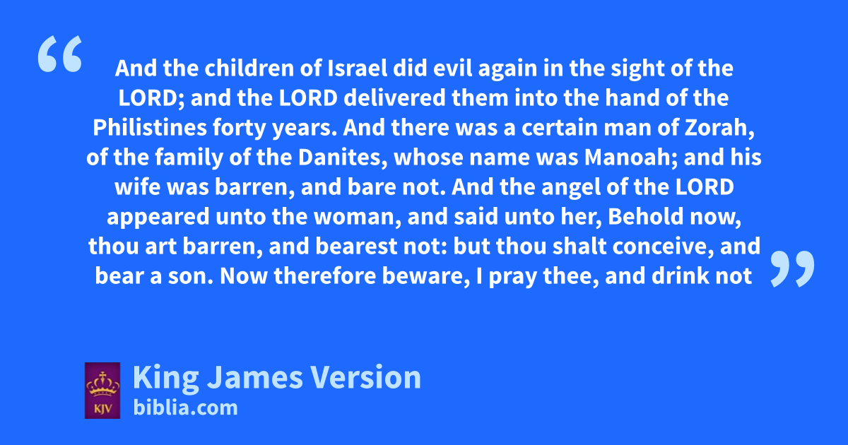 13 *And the children of Israel †adid evil again in the sight of the Lord; ||and the Lord delivered them binto the hand of the Philistines forty years. 2 And there was a certain man of cZorah, of the family of the Danites, whose name was Manoah; and his wife was dbarren, and bare not. 3 And the eangel of the Lord appeared unto the woman, and said unto her, Behold now, thou art barren, and bearest not: but thou shalt conceive, and bear a son. 4 Now therefore beware, I pray thee, and fdrink not wine nor strong drink, and eat not any unclean thing: 5 For, lo, thou shalt conceive, and bear a son; and no grasor shall come on his head: for the child shall be ha Nazarite unto God from the womb: and he shall ibegin to deliver Israel out of the hand of the Philistines. 6 Then the woman came and told her husband, saying, jA man of God came unto me, and his kcountenance was like the countenance of an angel of God, very terrible: but I lasked him not lwhence he was, neither told he me mhis name: 7 But he said unto me, nBehold, thou shalt conceive, and bear a son; and now drink no wine nor strong drink, neither eat any unclean thing: for the child shall be a Nazarite to God from the womb to the day of his death.