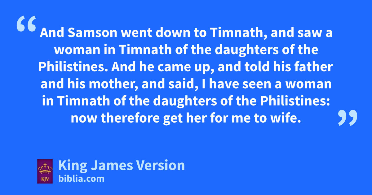 14 *And Samson went down ato Timnath, and saw a woman in Timnath of the daughters of the Philistines. 2 And he came up, and told his father and his mother, and said, I have seen a woman in Timnath of the daughters of the Philistines: now therefore bget her for me to wife. 3 Then his father and his mother said unto him, Is there never a woman among the daughters of cthy brethren, or among all my people, that thou goest to take a wife of the duncircumcised Philistines? And Samson said unto his father, Get her for me; for †she pleaseth me well. 4 But his father and his mother knew not that it was eof the Lord, that he sought an occasion against the Philistines: for at that time fthe Philistines had dominion over Israel. 5 Then went Samson down, and his father and his mother, to Timnath, and came to the vineyards of Timnath: and, behold, ga young lion roared †against him. 6 And hthe Spirit of the Lord came mightily upon him, and he rent him as he would have rent a kid, and he had nothing in his hand: but he told not his father or his mother what he had done. 7 And he went down, and talked with the woman; and she pleased Samson well.