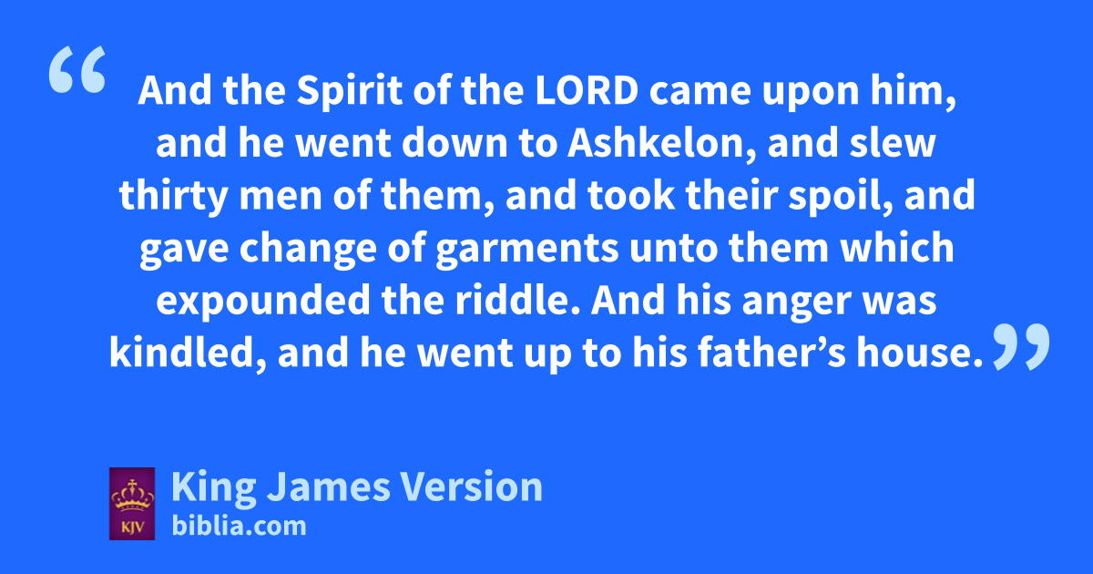 19 And qthe Spirit of the Lord came upon him, and he went down to rAshkelon, and slew thirty men of them, and took their ||spoil, and gave lchange of garments unto them which expounded the riddle. And his anger was kindled, and he went up to his father’s house. 20 But Samson’s wife swas given to his companion, whom he had tused as his friend.