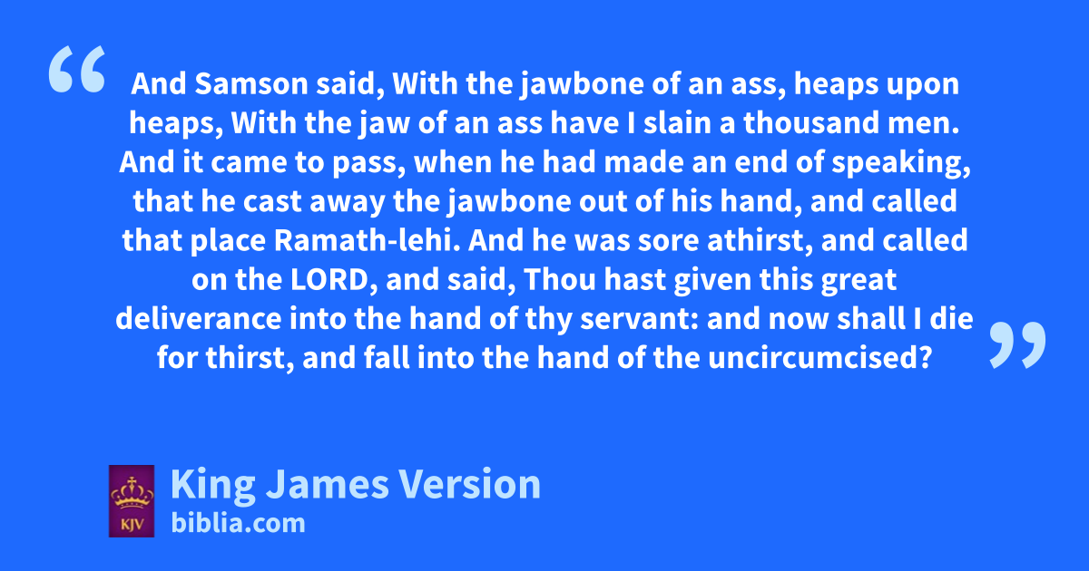 9 Then the Philistines went up, and pitched in Judah, and fspread themselves in gLehi. 10 And the men of Judah said, Why are ye come up against us? And they answered, To bind Samson are we come up, to do to him as he hath done to us. 11 Then three thousand men of Judah †went to dthe top of the rock Etam, and said to Samson, Knowest thou not that the Philistines are hrulers over us? what is this that thou hast done unto us? And he said unto them, As they did unto me, so have I done unto them. 12 And they said unto him, We are come down to bind thee, that we may deliver thee into the hand of the Philistines. And Samson said unto them, Swear unto me, that ye will not fall upon me yourselves. 13 And they spake unto him, saying, No; but we will bind thee fast, and deliver thee into their hand: but surely we will not kill thee. And they bound him with two inew cords, and brought him up from the rock. 14 And when he came unto Lehi, the Philistines shouted against him: and jthe Spirit of the Lord came mightily upon him, and ithe cords that were upon his arms became as flax that was burnt with fire, and his bands †loosed from off his hands. 15 And he found a †new jawbone of an ass, and put forth his hand, and took it, and kslew a thousand men therewith. 16 And Samson said,