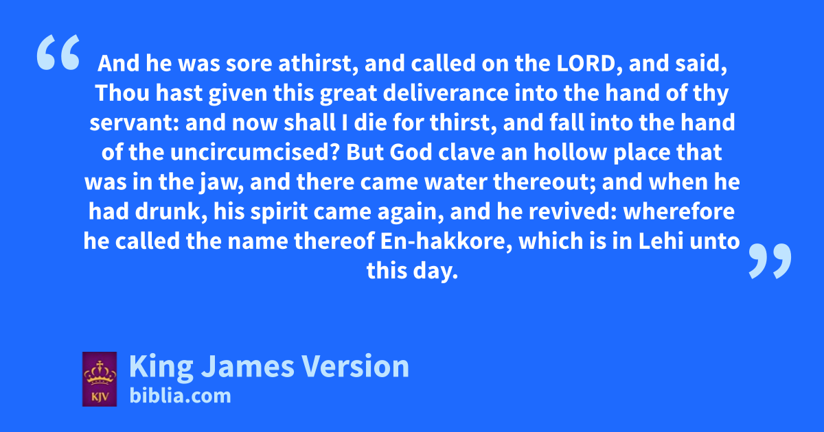 18 And he was sore athirst, and called on the Lord, and said, Thou hast given this great deliverance into the hand of thy servant: and now shall I die for thirst, and fall into the hand of the uncircumcised? 19 But God clave lan hollow place that was in ||the jaw, and there came water thereout; and when he had drunk, mhis spirit came again, and he revived: wherefore he called the name thereof ||En-hakkore, which is in Lehi unto this day. 20 ||And he judged Israel nin the days of the Philistines twenty years.