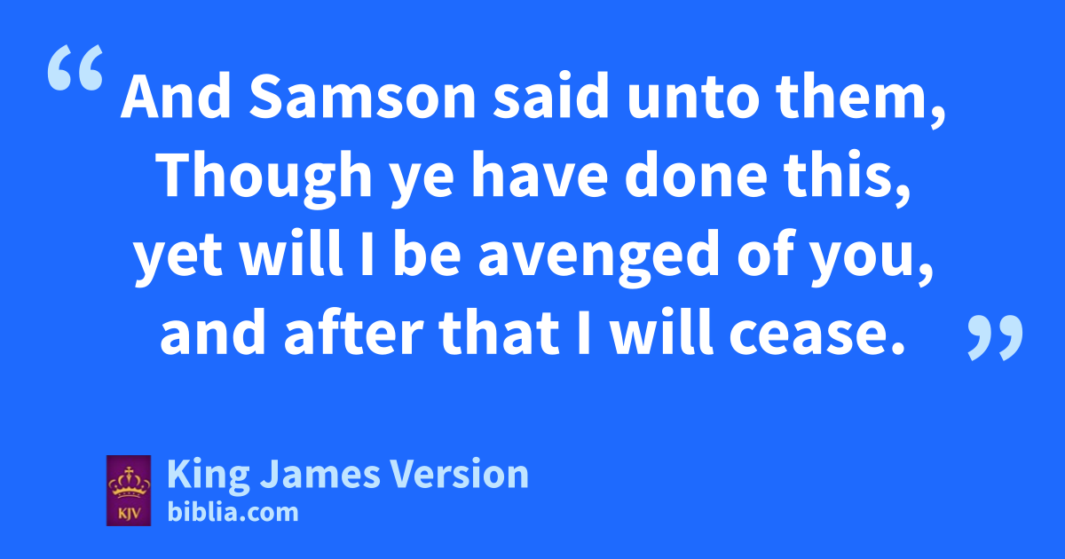 15 *But it came to pass within a while after, in the time of wheat harvest, that Samson visited his wife with aa kid; and he said, I will go in to my wife into the chamber. But her father would not suffer him to go in. 2 And her father said, I verily thought that thou hadst utterly hated her; therefore I gave her to thy companion: is not her younger sister fairer than she? †take her, I pray thee, instead of her. 3 And Samson said concerning them, ||Now shall I be more blameless than the Philistines, though I do them a displeasure. 4 And Samson went and caught three hundred foxes, and took ||firebrands, and turned tail to tail, and put a firebrand in the midst between two tails. 5 And when he had set the brands on fire, he let them go into the standing corn of the Philistines, and burnt up both bthe shocks, and also bthe standing corn, with the vineyards and olives. 6 Then the Philistines said, Who hath done this? And they answered, Samson, the son in law of the Timnite, because he had taken his wife, and given her to his companion. And the Philistines came up, and cburnt her and her father with fire. 7 And Samson said unto them, Though ye have done this, yet will I be avenged of you, and after that I will cease. 8 And he smote them hip and thigh with a great slaughter: and he went down and dwelt in dthe top of the rock eEtam.