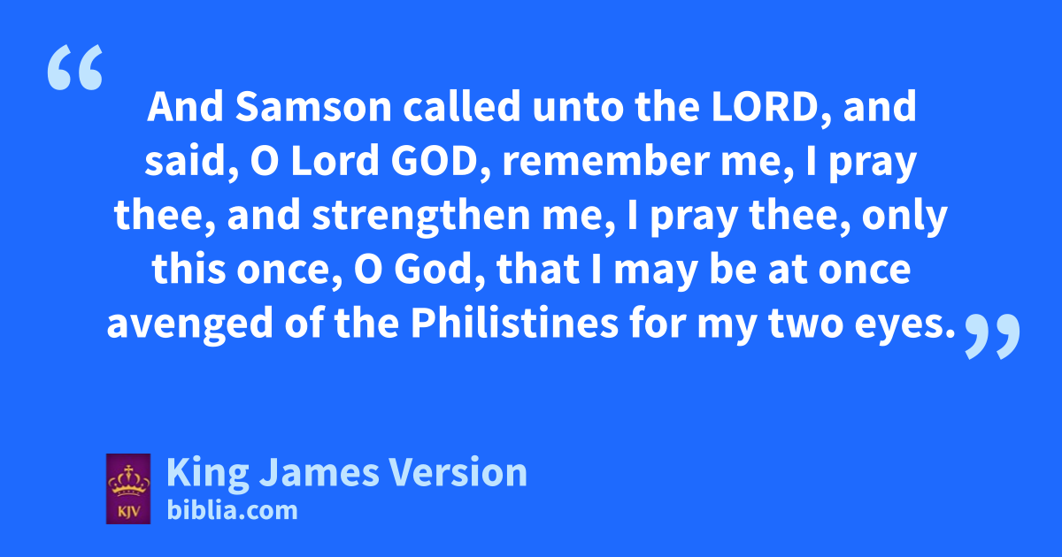 4 And it came to pass afterward, that he loved a woman ||in the valley of cSorek, whose name was Delilah. 5 And dthe lords of the Philistines came up unto her, and said unto her, eEntice him, and see wherein his great strength lieth, and by what means we may prevail against him, that we may bind him to ||afflict him: and we will give thee every one of us eleven hundred pieces of silver. 6 And Delilah said to Samson, Tell me, I pray thee, wherein thy great strength lieth, and wherewith thou mightest be bound to afflict thee. 7 And Samson said unto her, If they bind me with seven ||green withs that were never dried, then shall I be weak, and be as †another man. 8 Then the lords of the Philistines brought up to her seven ||green withs which had not been dried, and she bound him with them. 9 Now there were men lying in wait, abiding with her in the chamber. And she said unto him, The Philistines be upon thee, Samson. And he brake the withs, as a thread of tow is broken when it †toucheth the fire. So his strength was not known. 10 And Delilah said unto Samson, Behold, thou hast mocked me, and told me lies: now tell me, I pray thee, wherewith thou mightest be bound. 11 And he said unto her, If they bind me fast with fnew ropes †that never were occupied, gthen shall I be weak, and be as another man. 12 Delilah therefore took fnew ropes, and bound him therewith, and said unto him, The Philistines be upon thee, Samson. And there were liers in wait abiding in the chamber. And he brake them from off his arms like a thread. 13 And Delilah said unto Samson, Hitherto thou hast mocked me, and told me lies: tell me wherewith thou mightest be bound. And he said unto her, If thou weavest the seven locks of my head with the web. 14 And hshe fastened it with the pin, and said unto him, The Philistines be upon thee, Samson. And he awaked out of his sleep, and went away with the pin of the beam, and with the web. 15 And she said unto him, iHow canst thou say, I love thee, when thine heart is not with me? thou hast mocked me these three times, and hast not told me wherein thy great strength lieth. 16 And it came to pass, when she kpressed him daily with her words, and urged him, so that his soul was †vexed unto death; 17 That he told her all his heart, and said unto her, lThere hath not come a rasor upon mine head; for I have been a Nazarite unto God from my mother’s womb: if I be shaven, then my strength will go from me, and I shall become weak, and be like any other man. 18 And when Delilah saw that he had told her all his heart, she sent and called for the lords of the Philistines, saying, Come up this once, for he hath shewed me all his heart. Then the lords of the Philistines came up unto her, and brought mmoney in their hand. 19 And she made him sleep upon her knees; and she called for a man, and she caused him to shave off the seven locks of his head; and she began to nafflict him, and his strength went from him. 20 And she said, The Philistines be upon thee, Samson. And he awoke out of his sleep, and said, I will go out as at other times before, and oshake myself. And he wist not that pthe Lord was departed from him. 21 But the Philistines took him, and †put out his eyes, and brought him down to Gaza, and qbound him with fetters of brass; and rhe did grind in the prison house. 22 Howbeit the hair of his head began to grow again ||after he was shaven.