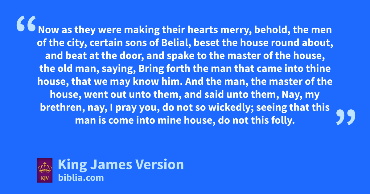 16 And, behold, there came an old man from his work out of the field at even, which was also of imount Ephraim; and he sojourned in Gibeah: but the men of the place were jBenjamites. 17 And when he had lifted up his eyes, he saw a wayfaring man in the street of the city: and the old man said, Whither goest thou? and whence comest thou? 18 And he said unto him, We are passing from Beth-lehem-judah toward the side of mount Ephraim; from thence am I: and I went to Beth-lehem-judah, but I am now going to kthe house of the Lord; and there is no man that †receiveth me to house. 19 Yet lthere is both straw and provender for our asses; and there is bread and wine also for me, and for thy handmaid, and for the young man which is with thy servants: there is mno want of any thing. 20 And the old man said, nPeace be with thee; howsoever let all thy wants lie upon me; only olodge not in the street. 21 So he brought him into his house, and gave provender unto the asses: and pthey washed their feet, and did eat and drink. 22 Now as they were making their hearts merry, behold, the men of the city, certain qsons of Belial, beset the house round about, and beat at the door, and spake to the master of the house, the old man, saying, rBring forth the man that came into thine house, that we may know him. 23 And the man, the master of the house, went out unto them, and said unto them, sNay, my brethren, nay, I pray you, do not so wickedly; seeing that this man is come into mine house, tdo not this folly. 24 uBehold, here is my daughter a maiden, and his concubine; them I will bring out now, and whumble ye them, and do with them xwhat seemeth good unto you: but unto this man do not †so vile a thing. 25 But the men would not hearken to him: so the man took his concubine, and brought her forth unto them; and they knew her, and yabused her all the night until the morning: and when the day began to spring, they let her go. 26 Then came the woman zin the dawning of the day, and fell down at the door of the man’s house where her lord was, till it was light. 27 And her lord rose up in the morning, and opened the doors of the house, and went out to go his way: and, behold, the woman his concubine was fallen down at the door of the house, and her hands were upon the athreshold. 28 And he said unto her, Up, and let us be going. But bnone answered. Then the man took her up upon an ass, and the man rose up, and gat him unto his place.