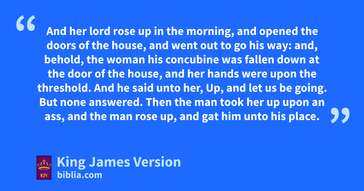 16 And, behold, there came an old man from his work out of the field at even, which was also of imount Ephraim; and he sojourned in Gibeah: but the men of the place were jBenjamites. 17 And when he had lifted up his eyes, he saw a wayfaring man in the street of the city: and the old man said, Whither goest thou? and whence comest thou? 18 And he said unto him, We are passing from Beth-lehem-judah toward the side of mount Ephraim; from thence am I: and I went to Beth-lehem-judah, but I am now going to kthe house of the Lord; and there is no man that †receiveth me to house. 19 Yet lthere is both straw and provender for our asses; and there is bread and wine also for me, and for thy handmaid, and for the young man which is with thy servants: there is mno want of any thing. 20 And the old man said, nPeace be with thee; howsoever let all thy wants lie upon me; only olodge not in the street. 21 So he brought him into his house, and gave provender unto the asses: and pthey washed their feet, and did eat and drink. 22 Now as they were making their hearts merry, behold, the men of the city, certain qsons of Belial, beset the house round about, and beat at the door, and spake to the master of the house, the old man, saying, rBring forth the man that came into thine house, that we may know him. 23 And the man, the master of the house, went out unto them, and said unto them, sNay, my brethren, nay, I pray you, do not so wickedly; seeing that this man is come into mine house, tdo not this folly. 24 uBehold, here is my daughter a maiden, and his concubine; them I will bring out now, and whumble ye them, and do with them xwhat seemeth good unto you: but unto this man do not †so vile a thing. 25 But the men would not hearken to him: so the man took his concubine, and brought her forth unto them; and they knew her, and yabused her all the night until the morning: and when the day began to spring, they let her go. 26 Then came the woman zin the dawning of the day, and fell down at the door of the man’s house where her lord was, till it was light. 27 And her lord rose up in the morning, and opened the doors of the house, and went out to go his way: and, behold, the woman his concubine was fallen down at the door of the house, and her hands were upon the athreshold. 28 And he said unto her, Up, and let us be going. But bnone answered. Then the man took her up upon an ass, and the man rose up, and gat him unto his place.
