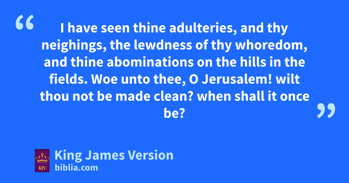 15 Hear ye, and give ear; be not proud: for the Lord hath spoken. 16 vGive glory to the Lord your God, before whe cause darkness, and before your feet stumble upon the dark mountains, and, while xye look for light, he turn it into ythe shadow of death, and make it zgross darkness. 17 But if ye will not hear it, my soul shall weep in secret places for your apride; and bmine eye shall weep sore, and run down with tears, because the Lord’s flock is carried away captive. 18 Say unto cthe king and to cdthe queen, Humble yourselves, sit down: for your ||principalities shall come down, even ethe crown of your glory. 19 The cities of the south shall be fshut up, and none shall open them: Judah shall be carried away captive all of it, it shall be wholly carried away captive. 20 Lift up your eyes, and behold gthem that come from the north: where is the flock that was given thee, thy beautiful flock? 21 What wilt thou say when he shall †punish thee? for thou hast taught them to be hcaptains, and as ichief over thee: kshall not sorrows take thee, as a woman in travail? 22 And if thou say in thine heart, lWherefore come these things upon me? For the greatness of thine iniquity are mthy skirts discovered, and thy heels ||made bare. 23 Can the Ethiopian change his skin, or nthe leopard his spots? othen may ye also do good, that are †accustomed to do evil. 24 Therefore will I scatter them pas the stubble that passeth away by the wind of the wilderness. 25 qThis is thy lot, the portion of thy measures from me, saith the Lord; because rthou hast forgotten me, and trusted in sfalsehood. 26 Therefore will I discover mtthy skirts upon thy face, that uthy shame may appear. 27 I have seen thine adulteries, and thy vneighings, the lewdness of thy whoredom, and thine abominations won the hills in the fields. Woe unto thee, O Jerusalem! xwilt thou not be made clean? †when shall it once be?