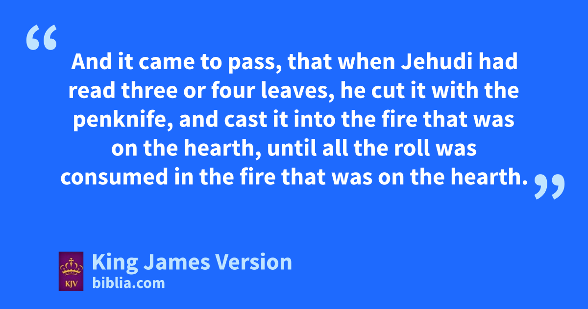 20 And they went in to the king into the court, but they laid up the roll ain the chamber of Elishama the scribe, and told all the words in the ears of the king. 21 So the king sent Jehudi to fetch the roll: and he took it out of aElishama the scribe’s chamber. And Jehudi read it in the ears of the king, and in the ears of all the princes bwhich stood beside the king. 22 Now the king sat in cthe winterhouse din the ninth month: and there was a fire on the hearth burning before him. 23 And it came to pass, that when Jehudi had read three or four leaves, he cut it with the penknife, and cast it into the fire that was on the hearth, until all the roll was consumed in the fire that was on the hearth. 24 yYet they were not afraid, enor frent their garments, neither the king, nor any of his servants that heard all these words. 25 Nevertheless gElnathan and Delaiah and Gemariah hhad made intercession to the king that he would not burn the roll: but he would not hear them. 26 But the king commanded Jerahmeel the son ||of Hammelech, and Seraiah the son of Azriel, and xShelemiah the son of Abdeel, ito take Baruch the scribe and Jeremiah the prophet: but the Lord hid them.