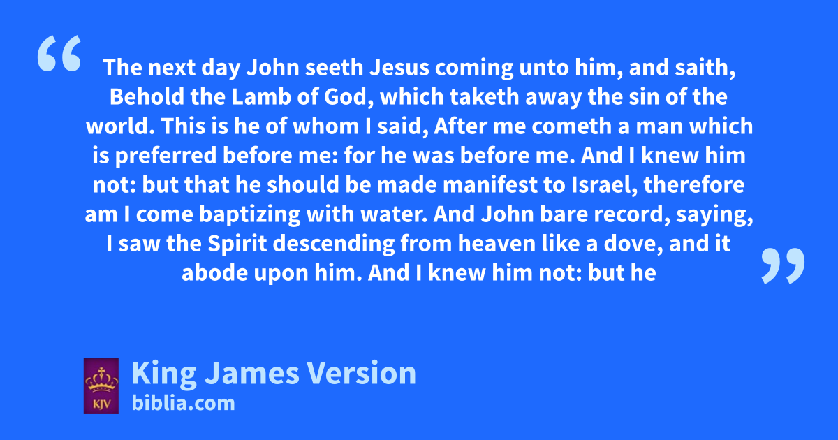 29 The next day John seeth Jesus coming unto him, and saith, Behold ithe Lamb of God, which j||taketh away the sin of the world. 30 kThis is he of whom I said, After me cometh a man which is preferred before me: for he was lbefore me. 31 And I knew him not: but that he should llbe made manifest to Israel, mtherefore am I come baptizing with water. 32 And John nbare record, saying, oI saw the Spirit descending from heaven like a dove, and it abode upon him. 33 And I knew him not: but he that sent me to baptize with water, the same said unto me, Upon whom thou shalt see the Spirit descending, and remaining on him, the same is phe which baptizeth with the Holy Ghost. 34 And I saw, and nbare record that this is qthe Son of God.