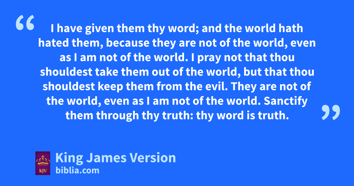 6 oI have manifested thy name unto the men pwhich thou gavest me out of the world: zthine they were, and thou gavest them me; and qthey have kept thy word. 7 Now they have known that all things whatsoever thou hast given me are rof thee. 8 For I have given unto them sthe words which thou gavest me; and they have received them, and thave known surely that I came out from thee, and they thave ubelieved that wthou didst send me. 9 xI pray for them: I ypray not for the world, but for them pwhich thou hast given me; for zthey are thine. 10 And all mine are thine, and athine are mine; and I am glorified bin them. 11 And now cI am no more in the world, but dthese are in the world, and I come to thee. eHoly Father, fkeep gthrough thine own name those hwhom thou hast given me, ithat they may be one, kas we are. 12 While I was with them in the world, I fkept them gin thy name: those hthat thou gavest me I have kept, and lnone of them is lost, but mthe son of perdition; nthat the scripture might be fulfilled. 13 oAnd now come I to thee; and these things I speak in the world, that they might have pmy joy fulfilled in themselves. 14 qI have given them thy word; and rthe world hath hated them, sbecause they are not of the world, even as tI am not of the world. 15 I pray not that thou shouldest take them out of the world, but that thou shouldest fkeep them from uthe evil. 16 wThey are not of the world, even as I am not of the world. 17 xSanctify them ythrough thy truth: zthy word is atruth. 18 bAs thou hast sent me into the world, even so have I also sent them into the world. 19 And for their sakes I csanctify myself, that they also might be ||dsanctified through the truth. 20 Neither pray I for these alone, but for them also which shall believe on me ethrough their word; 21 That fthey all may be one; as gthou, Father, art in me, and I in thee, that hthey also may be one in us: that the world may ibelieve that kthou hast sent me. 22 And lthe glory which thou gavest me mI have given them; hthat they may be one, even as we are one: 23 gmI in them, and thou in me, that nthey may be made perfect in one; and othat the world may know that kthou hast sent me, and hast loved them, as thou hast loved me. 24 Father, I will that pthey also, qwhom thou hast given me, be with me where rI am; that sthey may behold my glory, lwhich thou hast given me: for thou lovedst me tbefore the foundation of the world. 25 O urighteous Father, vthe world hath not known thee: but wI have known thee, and these xhave known that kthou hast sent me. 26 And yI have declared unto them thy name, and will declare it: that the love zwherewith thou hast loved me may be in them, gand I in them.
