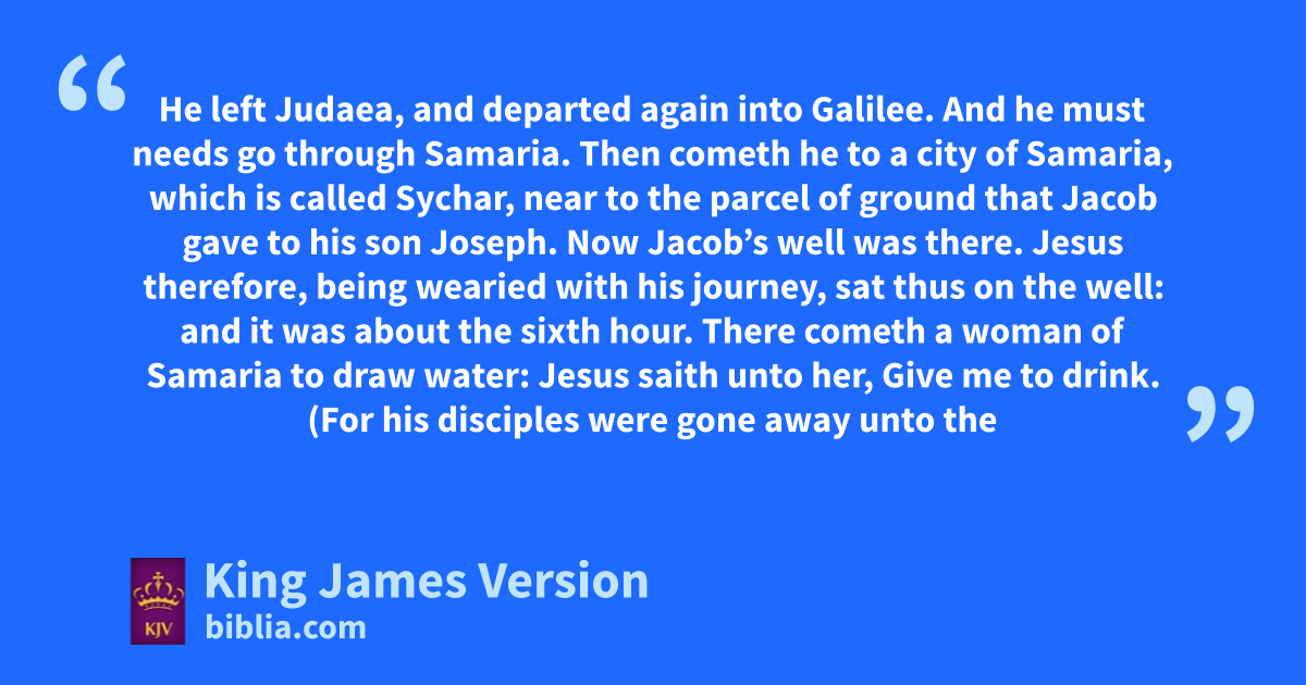 4 When therefore the Lord knew how the Pharisees had heard that Jesus made and abaptized more disciples than John, 2 (Though bJesus himself baptized not, but his disciples,) 3 He left cJudaea, and departed dagain into Galilee. 4 And he emust needs go through fSamaria. 5 Then cometh he to a city of Samaria, which is called gSychar, near to the parcel of ground hthat Jacob gave to his son Joseph. 6 Now Jacob’s well was there. Jesus therefore, being wearied iwith his journey, sat kthus on the well: and it was about lthe sixth hour. 7 There cometh a woman of Samaria to draw water: Jesus saith unto her, Give me to drink. 8 (For his disciples were gone away unto mthe city to buy meat.) 9 Then saith the woman of Samaria unto him, How is it that thou, being a Jew, askest drink of me, which am a woman of Samaria? for nthe Jews have no dealings with the Samaritans. 10 Jesus answered and said unto her, If thou knewest the gift of God, and who it is that saith to thee, Give me to drink; thou wouldest have asked of him, and he would have given thee oliving water. 11 The woman saith unto him, Sir, thou hast nothing to draw with, and the well is deep: from whence then hast thou that living water? 12 Art thou greater than our father Jacob, which gave us the well, and drank thereof himself, and his children, and his cattle? 13 Jesus answered and said unto her, Whosoever drinketh of this water shall thirst again: 14 But pwhosoever drinketh of the water that I shall give him shall never thirst; but the water that I shall give him shall be in him a well of water springing up into ppeverlasting life. 15 The woman saith unto him, qSir, give me this water, that I thirst not, neither come hither to draw. 16 Jesus saith unto her, Go, rcall thy husband, and come hither. 17 The woman answered and said, I have no husband. Jesus said unto her, Thou hast well said, I have no husband: 18 For thou hast had five husbands; and he whom thou now hast is not thy husband: in that saidst thou truly. 19 The woman saith unto him, Sir, I perceive that thou art sa prophet. 20 Our fathers worshipped in tthis mountain; and ye say, that in uJerusalem is the place where men ought to worship. 21 Jesus saith unto her, Woman, believe me, wthe hour cometh, xwhen ye shall neither in this mountain, nor yet at Jerusalem, worship ythe Father. 22 Ye worship zye know not what: we know what we worship: afor salvation is of the Jews. 23 But wthe hour cometh, and now is, when the true worshippers shall worship the Father in bspirit and in ctruth: for the Father dseeketh such to worship him. 24 eGod is a Spirit: and they that worship him must worship him in bspirit and in ctruth. 25 The woman saith unto him, I know that fMessias cometh, which is called Christ: when he is come, ghe will htell us all things. 26 Jesus saith unto her, iI that speak unto thee am he.