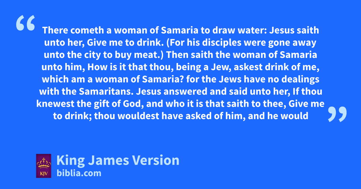 4 When therefore the Lord knew how the Pharisees had heard that Jesus made and abaptized more disciples than John, 2 (Though bJesus himself baptized not, but his disciples,) 3 He left cJudaea, and departed dagain into Galilee. 4 And he emust needs go through fSamaria. 5 Then cometh he to a city of Samaria, which is called gSychar, near to the parcel of ground hthat Jacob gave to his son Joseph. 6 Now Jacob’s well was there. Jesus therefore, being wearied iwith his journey, sat kthus on the well: and it was about lthe sixth hour. 7 There cometh a woman of Samaria to draw water: Jesus saith unto her, Give me to drink. 8 (For his disciples were gone away unto mthe city to buy meat.) 9 Then saith the woman of Samaria unto him, How is it that thou, being a Jew, askest drink of me, which am a woman of Samaria? for nthe Jews have no dealings with the Samaritans. 10 Jesus answered and said unto her, If thou knewest the gift of God, and who it is that saith to thee, Give me to drink; thou wouldest have asked of him, and he would have given thee oliving water. 11 The woman saith unto him, Sir, thou hast nothing to draw with, and the well is deep: from whence then hast thou that living water? 12 Art thou greater than our father Jacob, which gave us the well, and drank thereof himself, and his children, and his cattle? 13 Jesus answered and said unto her, Whosoever drinketh of this water shall thirst again: 14 But pwhosoever drinketh of the water that I shall give him shall never thirst; but the water that I shall give him shall be in him a well of water springing up into ppeverlasting life. 15 The woman saith unto him, qSir, give me this water, that I thirst not, neither come hither to draw. 16 Jesus saith unto her, Go, rcall thy husband, and come hither. 17 The woman answered and said, I have no husband. Jesus said unto her, Thou hast well said, I have no husband: 18 For thou hast had five husbands; and he whom thou now hast is not thy husband: in that saidst thou truly. 19 The woman saith unto him, Sir, I perceive that thou art sa prophet. 20 Our fathers worshipped in tthis mountain; and ye say, that in uJerusalem is the place where men ought to worship. 21 Jesus saith unto her, Woman, believe me, wthe hour cometh, xwhen ye shall neither in this mountain, nor yet at Jerusalem, worship ythe Father. 22 Ye worship zye know not what: we know what we worship: afor salvation is of the Jews. 23 But wthe hour cometh, and now is, when the true worshippers shall worship the Father in bspirit and in ctruth: for the Father dseeketh such to worship him. 24 eGod is a Spirit: and they that worship him must worship him in bspirit and in ctruth. 25 The woman saith unto him, I know that fMessias cometh, which is called Christ: when he is come, ghe will htell us all things. 26 Jesus saith unto her, iI that speak unto thee am he.