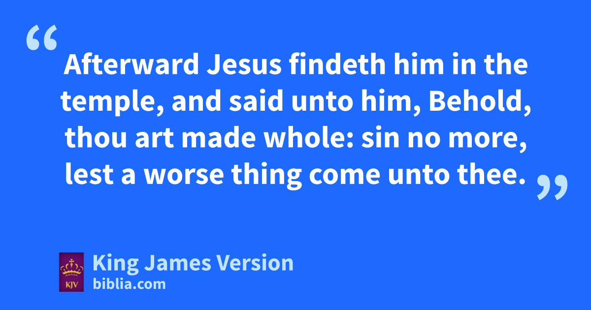 5 *After this there was aa feast of the Jews; and Jesus bwent up to Jerusalem. 2 Now there is at Jerusalem by the sheep ||market a pool, which is called bbin the Hebrew tongue Bethesda, having five porches. 3 In these lay a great multitude of impotent folk, of blind, halt, cwithered, waiting for the moving of the water. 4 For ccan angel went down at a certain season into the pool, and troubled the water: whosoever then first after the troubling of the water stepped in was made whole of whatsoever disease he had. 5 And a certain man was there, which had an infirmity thirty and eight years. 6 When Jesus saw him lie, and knew that he had been now a long time in that case, he saith unto him, Wilt thou be made whole? 7 The impotent man answered him, Sir, I have no man, when the water is troubled, to put me into the pool: but while I am coming, another steppeth down before me. 8 Jesus saith unto him, dRise, take up thy bed, and walk. 9 And immediately the man was made whole, and took up his bed, and walked: and on the same day ewas the sabbath. 10 fThe Jews therefore said unto him that was cured, It is the sabbath day: git is not lawful for thee to carry thy bed. 11 He answered them, He that made me whole, the same said unto me, Take up thy bed, and walk. 12 Then asked they him, What man is that which said unto thee, Take up thy bed, and walk? 13 And he that was healed wist not who it was: for Jesus had conveyed himself away, ||a multitude being in that place. 14 Afterward Jesus findeth him in the temple, and said unto him, Behold, thou art made whole: hsin no more, ilest a worse thing come unto thee. 15 The man departed, and told fthe Jews that it was Jesus, which had made him whole.