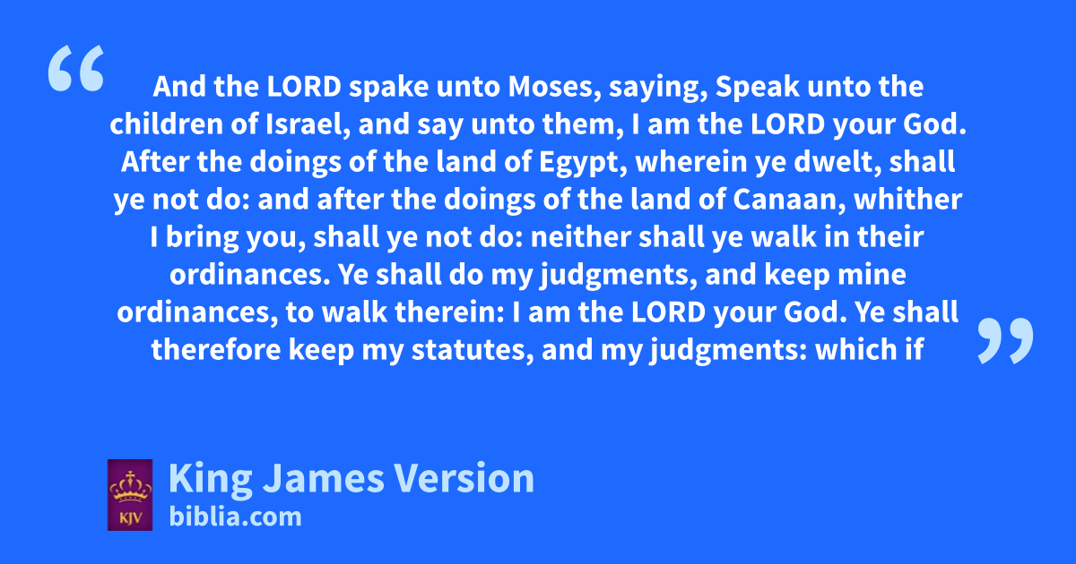 18 And the Lord spake unto Moses, saying, 2 Speak unto the children of Israel, and say unto them, aI am the Lord your God. 3 bAfter the doings of the land of Egypt, wherein ye dwelt, shall ye not do: and cafter the doings of the land of Canaan, whither I bring you, shall ye not do: neither shall ye walk in their dordinances. 4 eYe shall do my judgments, and keep mine ordinances, to walk therein: I am the Lord your God. 5 Ye shall therefore keep my statutes, and my judgments: fwhich if a man do, he shall live in them: I am the Lord.
