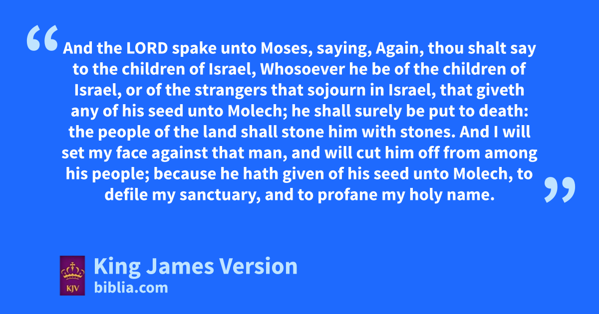 20 And the Lord spake unto Moses, saying, 2 aAgain, thou shalt say to the children of Israel, bWhosoever he be of the children of Israel, or of the strangers that sojourn in Israel, that giveth any of his seed unto Molech; he shall surely be put to death: the people of the land shall stone him with stones. 3 And cI will set my face against that man, and dwill cut him off from among his people; because he hath given of his seed unto Molech, to edefile my sanctuary, and fto profane my holy name. 4 And if the people of the land do any ways hide their eyes from the man, when he giveth of his seed unto Molech, and gkill him not: 5 Then I will set my face against that man, and against his family, and dwill cut him off, and all that hgo a whoring after him, to commit whoredom with Molech, from among their people. 6 And ithe soul that turneth after such as have familiar spirits, and after wizards, to go a whoring after them, kI will even set my face against that soul, and dwill cut him off from among his people. 7 lSanctify yourselves therefore, and be ye holy: for I am the Lord your God. 8 mAnd ye shall keep my statutes, and do them: nI am the Lord which sanctify you. 9 oFor every one that ocurseth his father or his mother shall be surely put to death: he hath cursed his father or his mother; phis blood shall be upon him.