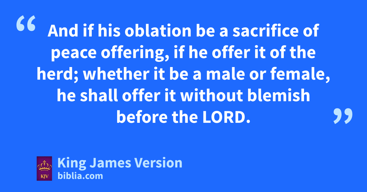 3 And if his oblation be a asacrifice of peace offering, if he offer it of the herd; whether it be a male or female, he shall offer it bwithout blemish before the Lord. 2 And che shall lay his hand upon the head of his offering, and kill it at the door of the tabernacle of the congregation: and Aaron’s sons the priests shall sprinkle the blood upon the altar round about. 3 And he shall offer of the sacrifice of the peace offering an offering made by fire unto the Lord; dthe ||fat that covereth the inwards, and all the ||fat that is upon the inwards, 4 And the two kidneys, and the fat that is on them, which is by the flanks, and the ||caul above the liver, with the kidneys, it shall he take away. 5 And Aaron’s sons eshall burn it on the altar upon the burnt sacrifice, which is upon the wood that is on the fire: it is an offering made by fire, of a sweet savour unto the Lord. 6 And if his offering for a sacrifice of peace offering unto the Lord be of the flock; male or female, fhe shall offer it without blemish. 7 If he offer a lamb for his offering, then shall he offer it before the Lord. 8 And he shall lay his hand upon the head of his offering, and kill it before the tabernacle of the congregation: and Aaron’s sons shall sprinkle the blood thereof round about upon the altar. 9 And he shall offer of the sacrifice of the peace offering an offering made by fire unto the Lord; the fat thereof, and gthe whole rump, it shall he take off hard by the backbone; and the fat that covereth the inwards, and all the fat that is upon the inwards, 10 And the two kidneys, and the fat that is upon them, which is by the flanks, and the caul above the liver, with the kidneys, it shall he take away. 11 And the priest shall burn it upon the altar: it is hthe food of the offering made by fire unto the Lord. 12 And if his offering be a goat, then ihe shall offer it before the Lord. 13 And he shall lay his hand upon the head of it, and kill it before the tabernacle of the congregation: and the sons of Aaron shall sprinkle the blood thereof upon the altar round about. 14 And he shall offer thereof his offering, even an offering made by fire unto the Lord; the fat that covereth the inwards, and all the fat that is upon the inwards, 15 And the two kidneys, and the fat that is upon them, which is by the flanks, and the caul above the liver, with the kidneys, it shall he take away. 16 And the priest shall burn them upon the altar: it is the food of the offering made by fire for a sweet savour: kall the fat is the Lord’s. 17 It shall be a lperpetual statute for your generations throughout all your dwellings, that ye eat neither kfat nor mblood.