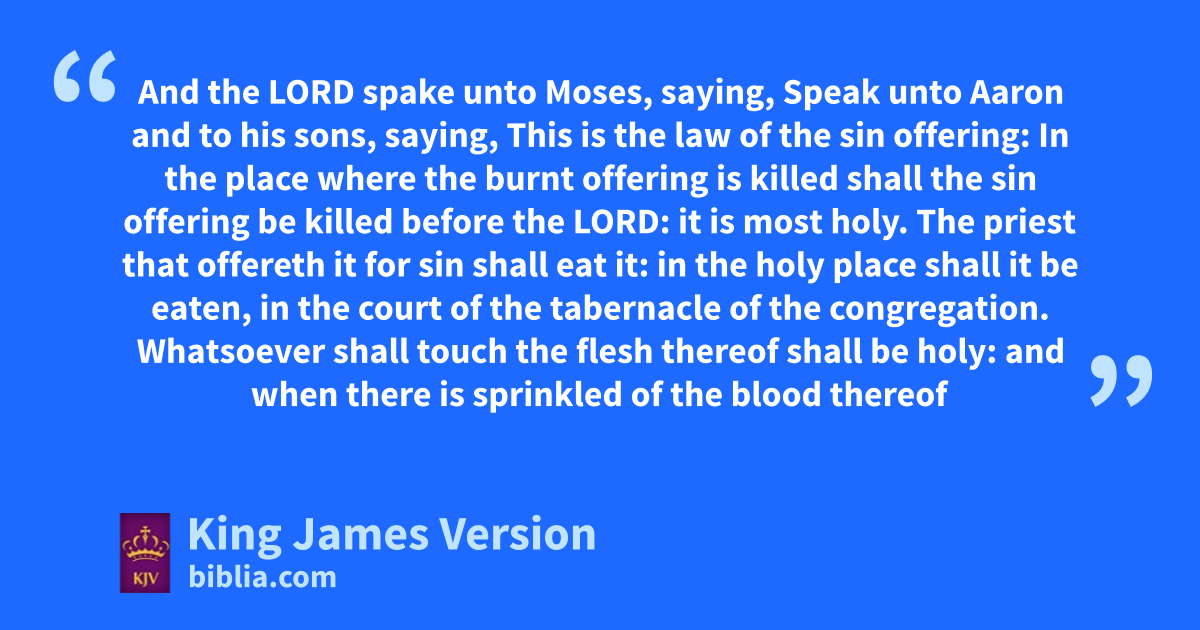 24 And the Lord spake unto Moses, saying, 25 Speak unto Aaron and to his sons, saying, fThis is the law of the sin offering: gIn the place where the burnt offering is killed shall the sin offering be killed before the Lord: hit is most holy. 26 iThe priest that offereth it for sin shall eat it: kin the holy place shall it be eaten, in the court of the tabernacle of the congregation. 27 lWhatsoever shall touch the flesh thereof shall be holy: and when there is sprinkled of the blood thereof upon any garment, thou shalt wash that whereon it was sprinkled in the holy place. 28 But the earthen vessel wherein it is sodden mshall be broken: and if it be sodden in a brasen pot, it shall be both scoured, and rinsed in water. 29 nAll the males among the priests shall eat thereof: oit is most holy. 30 pAnd no sin offering, whereof any of the blood is brought into the tabernacle of the congregation to reconcile withal in the holy place, shall be eaten: it shall be burnt in the fire.