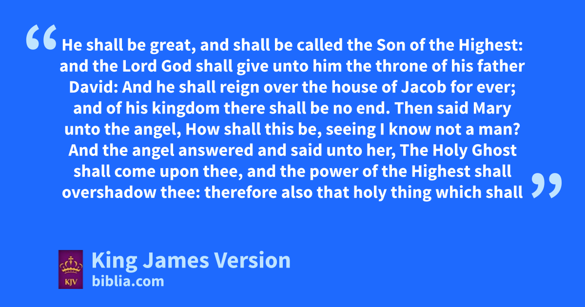 26 And in dthe sixth month the angel eGabriel was sent from God unto a city of Galilee, named fNazareth, 27 To a virgin gespoused to a man whose name was Joseph, hof the house of David; and the virgin’s name was Mary. 28 And the angel came in unto her, and said, Hail, ithou that art ||highly favoured, lthe Lord is with thee: mblessed art thou among women. 29 And when she saw him, nshe was troubled at his saying, and nncast in her mind what manner of salutation this should be. 30 And the angel said unto her, Fear not, Mary: for thou hast ofound favour with God. 31 And, behold, pthou shalt conceive in thy womb, and bring forth a son, and qshalt call his name JESUS. 32 He shall be great, and shall be called the Son of rthe Highest: and the Lord God shall sgive unto him tthe throne of his father David: 33 And he shall reign over the house of Jacob ufor ever; and of his kingdom there shall be no end. 34 Then said Mary unto the angel, How shall this be, seeing I know not a man? 35 And the angel answered and said unto her, xThe Holy Ghost shall come upon thee, and the power of rthe Highest shall overshadow thee: therefore also ythat holy thing which shall be born of thee shall be called zthe Son of God. 36 And, behold, thy acousin Elisabeth, she hath also conceived a son in her old age: and this is the sixth month with her, who was called bbarren. 37 For cwith God nothing shall be impossible. 38 And Mary said, Behold the handmaid of the Lord; dbe it unto me according to thy word. And the angel departed from her.