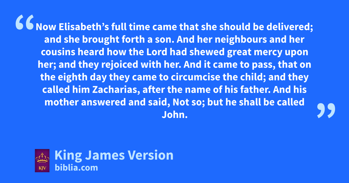 57 Now Elisabeth’s full time came that she should be delivered; and she brought forth a son. 58 And hher neighbours and her icousins heard how the Lord had kshewed great mercy upon her; and lthey rejoiced with her. 59 And it came to pass, that mon the eighth day they came to circumcise the child; and nthey called him Zacharias, after the name of his father. 60 And his mother answered and said, Not so; but ohe shall be called John. 61 And they said unto her, There is none of thy kindred that is called by this name. 62 And they pmade signs to his father, how he would have him called. 63 And he asked for a writing table, and wrote, saying, qHis name is John. And they marvelled all. 64 rAnd his mouth was opened immediately, and his tongue sloosed, and he spake, and tpraised God. 65 And ufear came on all that dwelt round about them: and all these ||sayings were noised abroad throughout all vthe hill country of Judaea. 66 And all they that heard them wlaid them up in their hearts, saying, What manner of child shall this be! And xthe hand of the Lord was with him. 67 And his father Zacharias ywas filled with the Holy Ghost, and prophesied, saying,