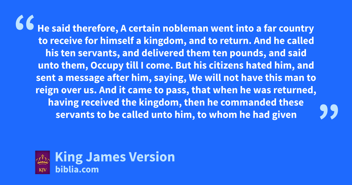 11 And as they heard these things, he radded and spake a parable, because he was nigh to Jerusalem, and because sthey thought that the kingdom of God should immediately appear. 12 He said therefore, tA certain unobleman wwent into a far country to receive for himself a kingdom, and to return. 13 And he called his xten servants, and delivered them ten ||pounds, and said unto them, Occupy till I come. 14 But yhis citizens hated him, and sent a message after him, saying, We will not have this man to reign over us. 15 And it came to pass, that when he was returned, having received the kingdom, then he commanded these servants to be called unto him, to whom he had given the †money, that he might know how much every man had gained by trading. 16 Then came the first, saying, Lord, thy pound hath gained ten pounds. 17 And he said unto him, Well, thou good servant: because thou hast been zfaithful in aa very little, have thou authority over ten cities. 18 And the second came, saying, Lord, thy pound hath gained five pounds. 19 And he said likewise to him, Be thou also over five cities. 20 And another came, saying, Lord, behold, here is thy pound, which I have kept laid up in a bnapkin: 21 cFor I feared thee, because thou art an daustere man: thou takest up that thou layedst not down, and reapest that thou didst not sow. 22 And he saith unto him, eOut of thine own mouth will I judge thee, thou wicked servant. fThou knewest that I was an daustere man, taking up that I laid not down, and reaping that I did not sow: 23 Wherefore then gavest not thou my money into gthe bank, that at my coming I might have hrequired imine own with usury? 24 And he said unto them that stood by, Take from him the pound, and give it to him that hath ten pounds. 25 (And they said unto him, Lord, he hath ten pounds.) 26 For I say unto you, kThat unto every one which hath shall be given; and from him that hath not, even that he hath shall be taken away from him. 27 But those mine enemies, lwhich would not that I should reign over them, bring hither, and mslay them before me.