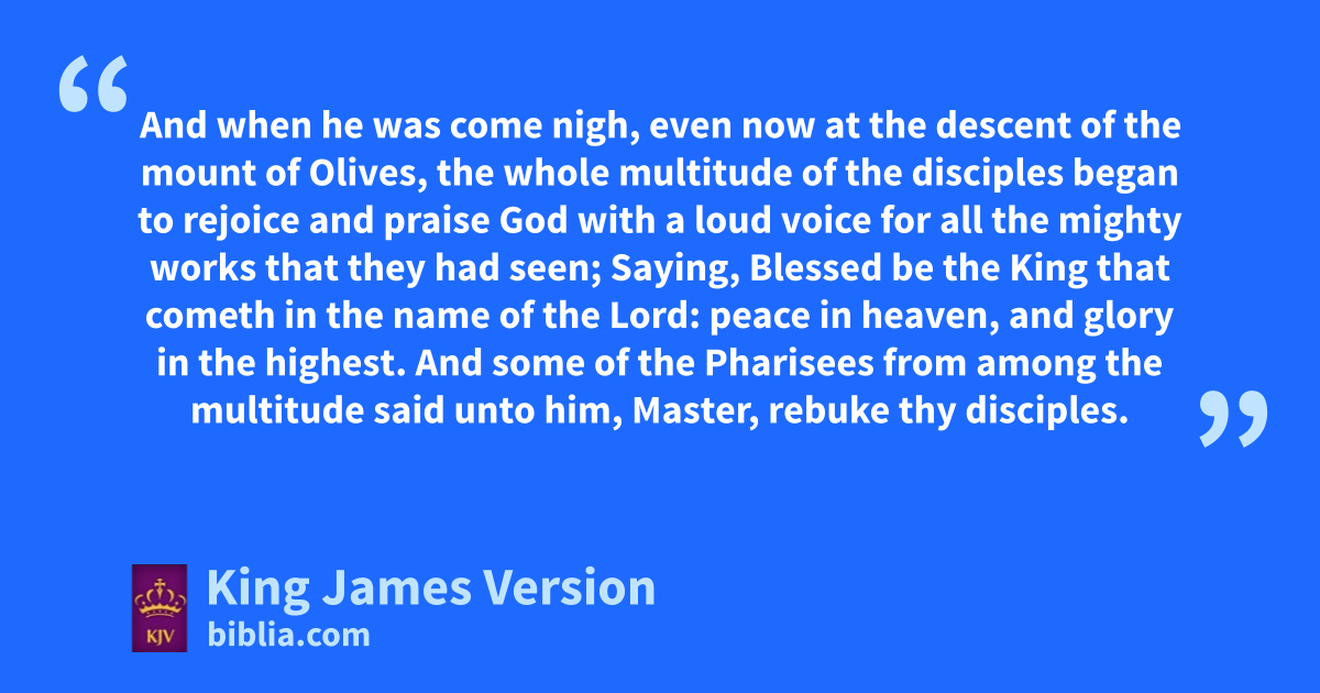 28 And when he had thus spoken, nhe went before, oascending up to Jerusalem. 29 And it came to pass, pwhen he was come nigh to Bethphage and Bethany, at the mount called the mount of Olives, he sent two of his disciples, 30 Saying, Go ye into the village over against you; in the which at your entering ye shall find a colt tied, whereon yet never man sat: loose him, and bring him hither. 31 And if any man ask you, Why do ye loose him? thus shall ye say unto him, Because the Lord hath need of him. 32 And they that were sent went their way, and found even as he had said unto them. 33 And as they were loosing the colt, qthe owners thereof said unto them, Why loose ye the colt? 34 And they said, The Lord hath need of him. 35 And they brought him to Jesus: rand they cast their garments upon the colt, and they set Jesus thereon. 36 And as he went, they spread their clothes in the way. 37 And when he was come nigh, even now at the descent of the mount of Olives, the whole multitude of the disciples began to rejoice and spraise God with a loud voice for all the tmighty works that they had seen; 38 Saying, Blessed be uthe King that cometh in the name of the Lord: wpeace in heaven, and glory in the highest. 39 xAnd some of the Pharisees from among the multitude said unto him, Master, rebuke thy disciples. 40 And he answered and said unto them, I tell you that, if these should hold their peace, ythe stones would immediately cry out.