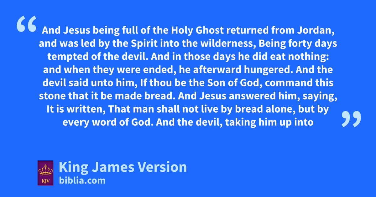4 And aJesus being full of the Holy Ghost breturned from Jordan, and was led cby the Spirit into the wilderness, 2 dBeing forty days tempted of the devil. And in those days he did eat nothing: and when they were ended, he afterward hungered. 3 And the devil said unto him, If thou be the Son of God, command this stone that it be made bread. 4 And Jesus answered him, saying, It is written, That ddman shall not live by bread alone, but by every word of God. 5 eAnd the devil, taking him up into an high mountain, shewed unto him all the kingdoms of fthe world in a moment of time. 6 And the devil said unto him, All this gpower will I give thee, and the glory of them: for gthat is delivered unto me; and to whomsoever I will I give it. 7 If thou therefore wilt ||worship me, all shall be thine. 8 And Jesus answered and said unto him, Get thee behind me, Satan: for it is written, hThou shalt worship the Lord thy God, and him only shalt thou serve. 9 iAnd he brought him to Jerusalem, and set him on a pinnacle of the temple, and said unto him, If thou be the Son of God, cast thyself down from hence: 10 For it is written, kHe shall give his angels charge over thee, to keep thee: 11 And in their hands they shall bear thee up, lest at any time thou dash thy foot against a stone. 12 And Jesus answering said unto him, It is said, lThou shalt not tempt the Lord thy God. 13 And when the devil had ended all the temptation, he departed from him mfor a season.