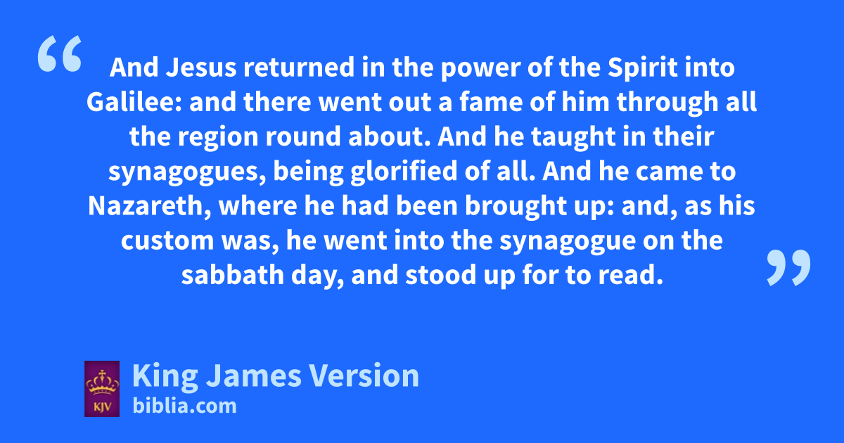 14 *nAnd Jesus returned oin the power of the Spirit into pGalilee: qand there went out a fame of him through all the region round about. 15 And rhe taught in their synagogues, being sglorified of all. 16 †tAnd he came to uNazareth, xwhere he had been brought up: and, as his custom was, rhe went into the synagogue on the sabbath day, and ystood up for to read. 17 zAnd there was delivered unto him the book of the prophet Esaias. And when he had aopened the book, he found the place where it was written, 18 bThe Spirit of the Lord is upon me, because he hath anointed me to preach the gospel to the poor; he hath sent me to heal the brokenhearted, to preach deliverance to the captives, cand recovering of sight to the blind, dto set at liberty them that are bruised, 19 bTo preach the eacceptable year of the Lord. 20 And he aclosed the book, and he gave it again to the fminister, and sat down. And the eyes of all them that were in the synagogue were gfastened on him. 21 And he began to say unto them, This day is this scripture fulfilled in your ears. 22 And all bare him witness, and wondered at the hgracious words which proceeded out of his mouth. And they said, iIs not this Joseph’s son? 23 And he said unto them, Ye will surely say unto me this proverb, kPhysician, heal thyself: whatsoever we have heard done in lCapernaum, do also here in mthy country. 24 And he said, Verily I say unto you, nNo prophet is eaccepted in mhis own country. 25 But I tell you of a truth, omany widows were pin Israel in the days of Elias, when the heaven was shut up qthree years and six months, when great famine was throughout all the land; 26 But unto none of them was Elias sent, save unto oSarepta, a city of ooSidon, unto a woman that was a widow. 27 rAnd many lepers were pin Israel in the time of Eliseus the prophet; and none of them was cleansed, saving Naaman the Syrian. 28 And all they in the synagogue, when they heard these things, were filled with wrath, 29 And rose up, and rrthrust him out of the city, and led him unto the ||brow of the hill whereon their city was built, that they might cast him down headlong. 30 But he spassing through the midst of them went his way, 31 And tcame down to Capernaum, a city of Galilee, and taught them on the sabbath days. 32 And uthey were astonished at his doctrine: for his word was xwith power.