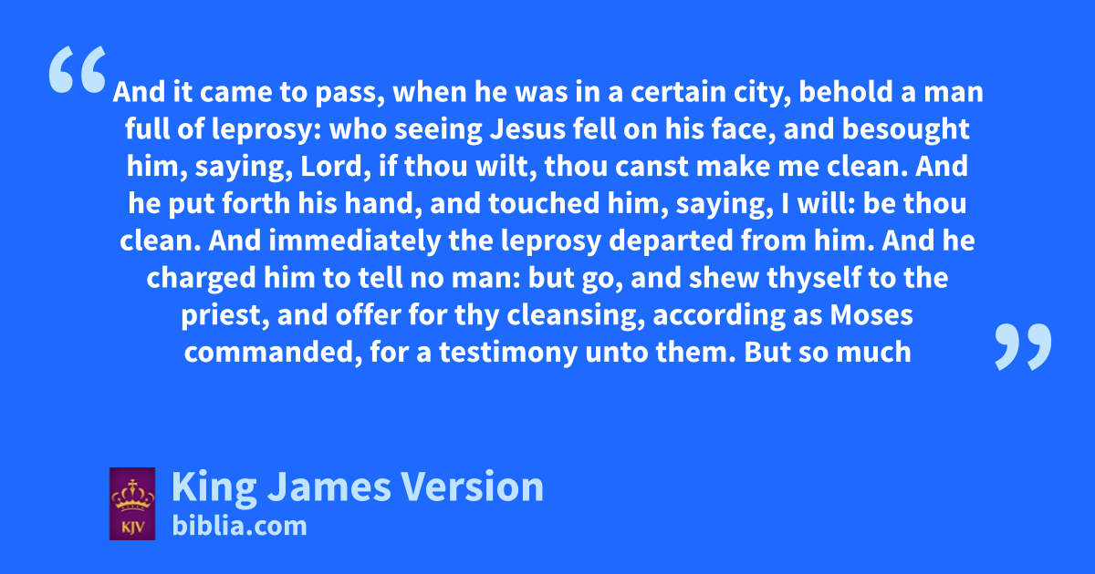 12 lAnd it came to pass, when he was in a certain city, behold a man full of leprosy: who seeing Jesus fell on his face, and besought him, saying, Lord, if thou wilt, thou canst make me clean. 13 And he put forth his hand, and touched him, saying, I will: be thou clean. And immediately the leprosy departed from him. 14 And he charged him to tell no man: mbut go, and shew thyself to the priest, and offer for thy cleansing, according as Moses commanded, for a testimony unto them. 15 nBut so much the more went there a fame abroad of him: and great multitudes came together to hear, and to be healed by him of their infirmities. 16 oAnd he withdrew himself into the wilderness, and oprayed.