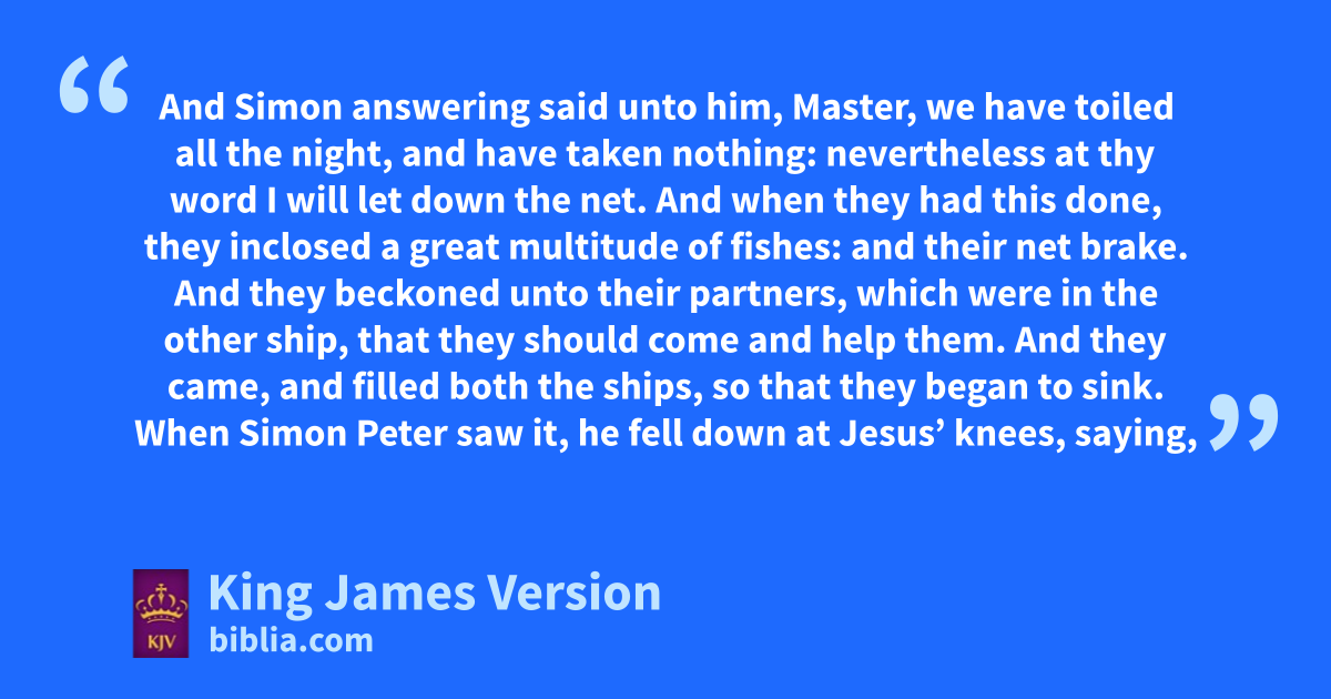 5 And ait came to pass, that, as the people pressed upon him to hear the word of God, he stood by bthe lake of Gennesaret, 2 cAnd saw two ships standing by the lake: but the fishermen were gone out of them, and were washing their nets. 3 And he entered into one of the ships, which was Simon’s, and prayed him that he would thrust out a little from the land. And he dsat down, and taught the people eout of the ship. 4 Now when he had left speaking, he said unto Simon, fLaunch out into the deep, and let down your nets for a draught. 5 And Simon answering said unto him, gMaster, ggwe have toiled all the night, and have taken nothing: nevertheless at thy word I will let down the net. 6 And when they had this done, fthey inclosed a great multitude of fishes: and their net brake. 7 And they beckoned unto their hpartners, which were in ithe other ship, that they should come and help them. And they came, and filled both the ships, so that they began to sink. 8 When Simon Peter saw it, iihe fell down at Jesus’ knees, saying, jDepart from me; for I am a sinful man, O Lord. 9 For he was astonished, and all that were with him, at the draught of the fishes which they had taken: 10 And so was also James, and John, the sons of Zebedee, which were hpartners with Simon. And Jesus said unto Simon, Fear not; from henceforth thou shalt catch men. 11 And when they had brought their ships to land, kthey forsook all, and followed him.
