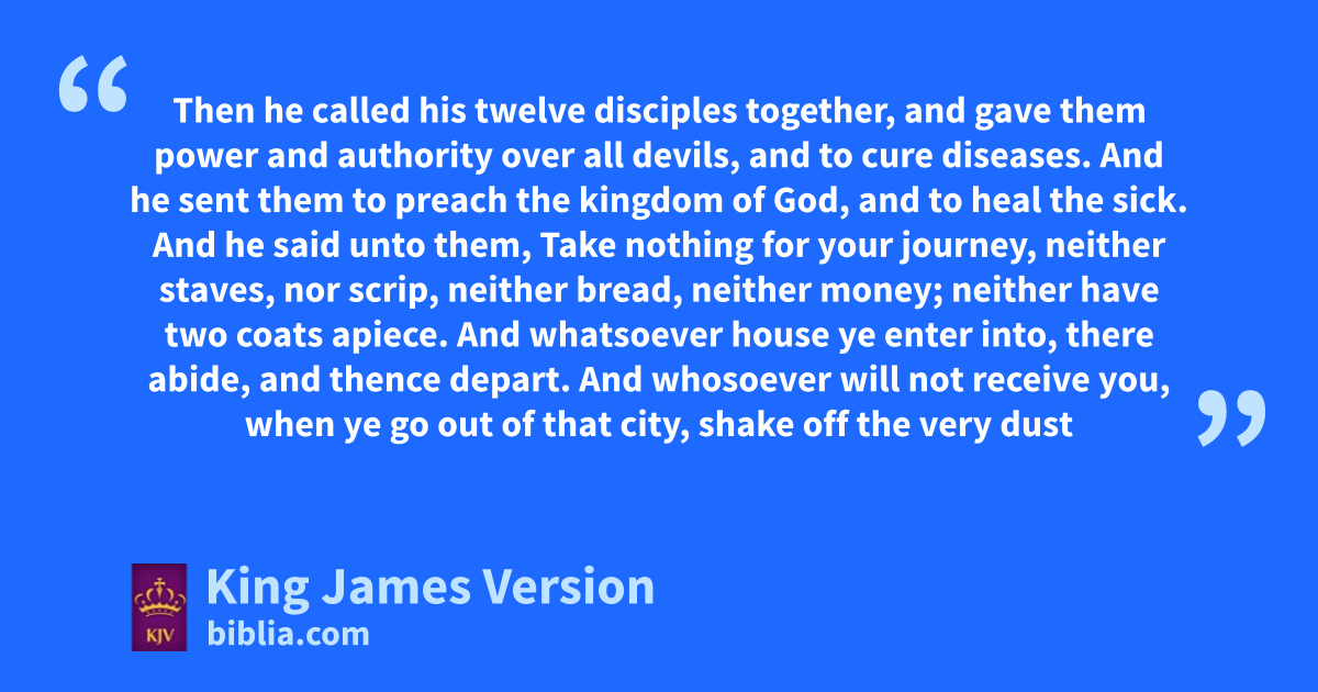 9 Then ahe called his twelve disciples together, and gave them power and authority over all devils, and to cure diseases. 2 And bhe sent them to preach the kingdom of God, and to heal the sick. 3 cAnd he said unto them, Take nothing for your journey, neither staves, nor scrip, neither bread, neither money; neither have two coats apiece. 4 And whatsoever house ye enter into, there abide, and thence depart. 5 And whosoever will not receive you, when ye go out of that city, shake off the very dust from your feet dfor a testimony against them. 6 eAnd they departed, and went through the towns, preaching the gospel, and healing every where.